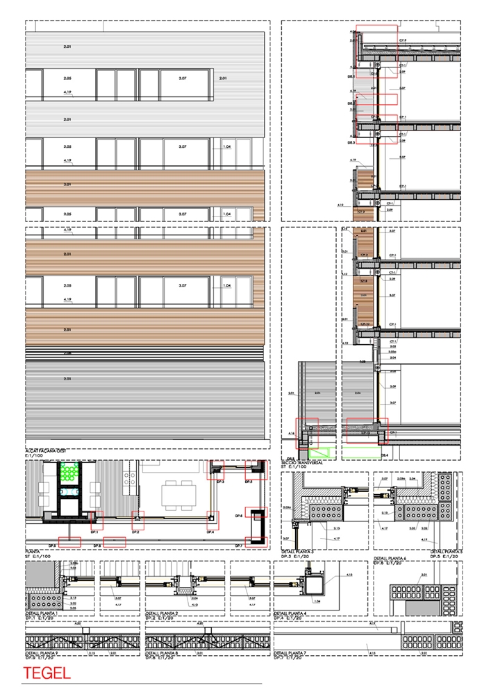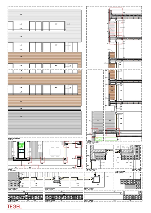 Dado la cantidad de dinteles que existe en cada fachada, y la morfología de los retranqueos horizontales de la composición de la misma- en que los paños entre ventanas no son de obra vista la manera de construir un único dintel corrido que a su vez sirva de apoyo a la obra de fábrica hasta el siguiente antepecho. Este dintel, al fraccionar la fachada en franjas horizontales, nos sirve para repartir las cargas de toda la fachada, y no dejar que la fábrica de obra vista de las cinco plantas esté únicamente sustentadas en los perfiles de arranque de la planta baja.