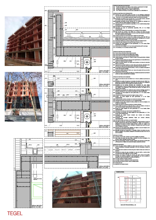 La tipología constructiva de las fachadas de la envolvente, es de fachada ventilada de obra de fábrica de cerámica de cara vista. El sistema constructivo escogido consiste en separar la hoja exterior de la fachada, de la estructura del edificio, de forma que se origine una cámara de aire continua, ésta es ocupada por el aislamiento propiciando que la fachada carezca de puentes térmicos. La hoja exterior (la fábrica de obra vista) se arma con armaduras de acero inoxidable las dos primeras hiladas (las del arranque del soporte) y cada 10 hiladas (60cm según el fabricante). Estas armaduras tipificadas se anclan con anclajes fijándolas en pilares de la estructura de hormigón, y a estructuras de soporte auxiliares consistentes en tubulares de hierro fijados a su vez de forjado a forjado.