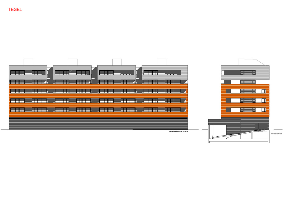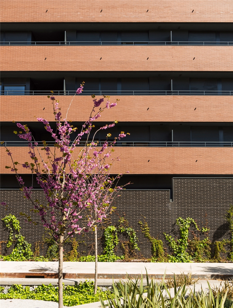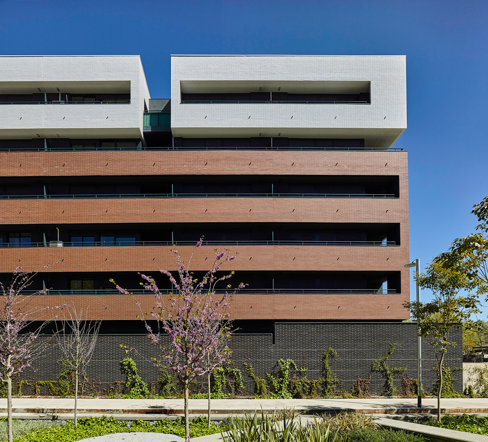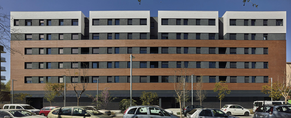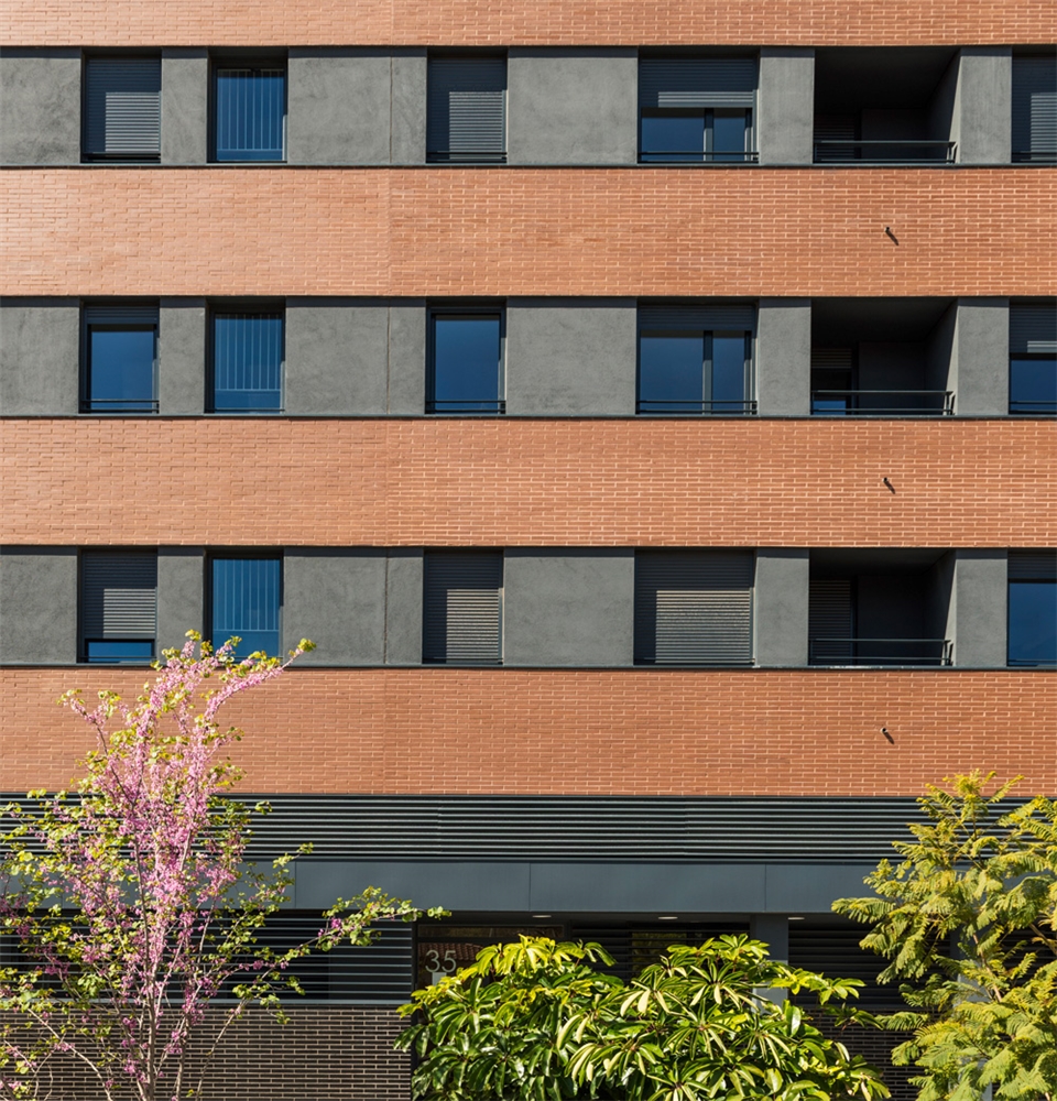 Concebimos el diseño de la siguiente manera: En planta baja, a modo de basamento, con una composición muy opaca, se usa obra vista de color negro brillante. En las primeras cuatro plantas, la obra vista es de color marrón oscuro configurando unas terrazas corridas (a poniente). Es a partir de la planta cuarta que “inventamos” una disposición volumétrica sincopada y forzamos un cambio en el edificio a modo de remate, para variar las proporciones del bloque, haciéndolo más apaisado.