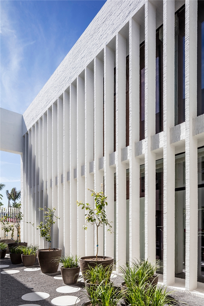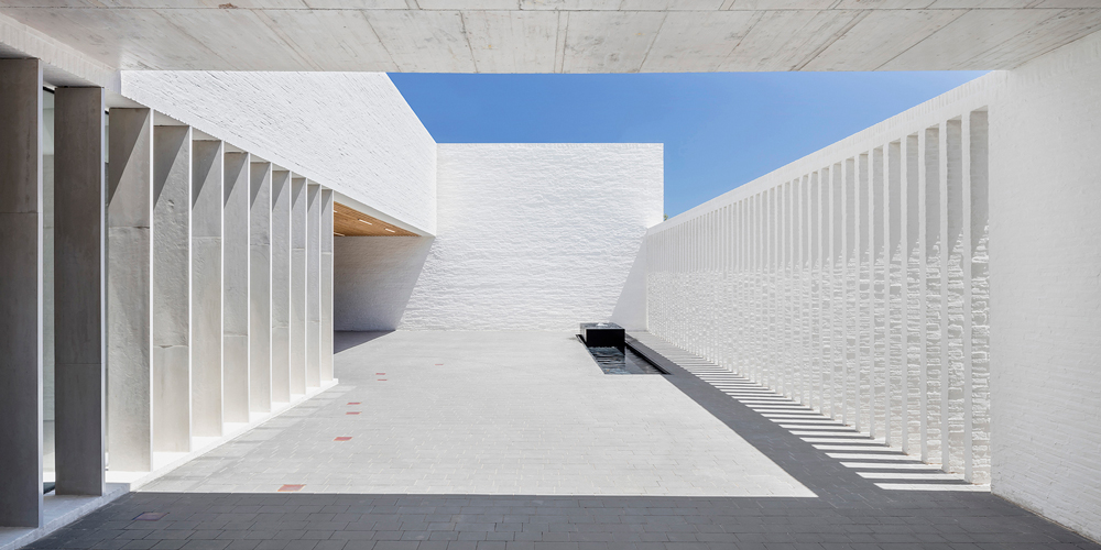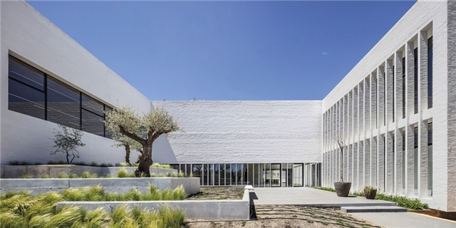 Las lamas cerámicas, de fabricación artesanal, y de obra vista tamizan la entrada de luz, proporcionando sombra a su interior. En contraste, la fachada norte se muestra totalmente abierta mediante un gran muro cortina con carpintería oculta. Los cerramientos, de doble capa, están compuestos de bloques de hormigón celular y una pared exterior de obra vista realizada con ladrillo semimanual texturizado con jabelga, reproduciendo la técnica autóctona del encalado de pueblos blancos de Andalucía y la tradición escandinava de proteger la obra de fábrica con una de lechada de mortero de cal. La cubierta ajardinada biodiversa atrae la fauna local y se convierte en un ecosistema para sí misma.