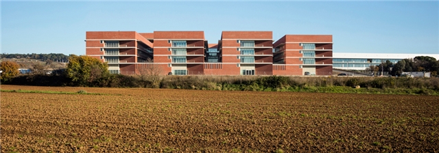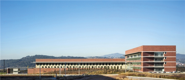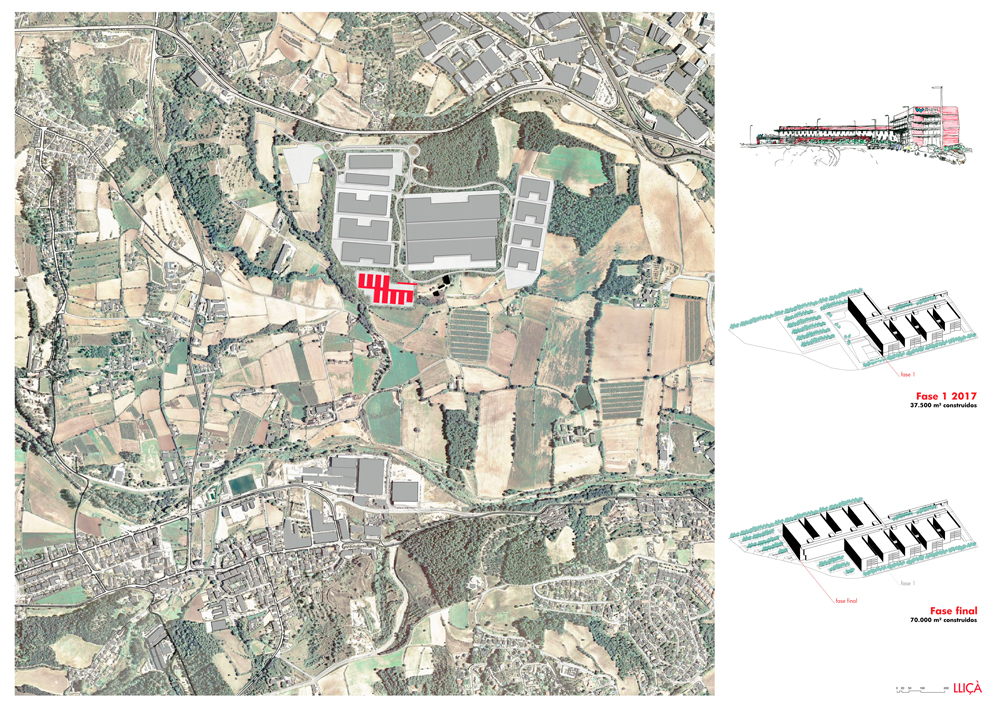 La segunda cuestión era como disponer un edificio de gran dimensión, en una parcela situada en el borde de un polígono industrial en el límite con los campos de cultivo y el paisaje natural característico de la comarca del Vallés Oriental, entre lo rural y lo industrial, entre lo natural y lo artificial.