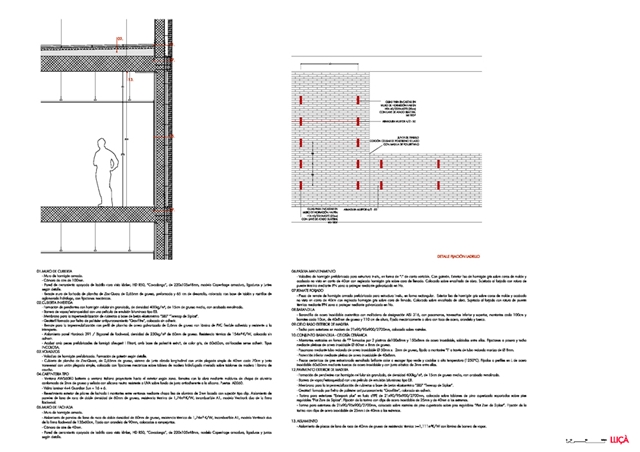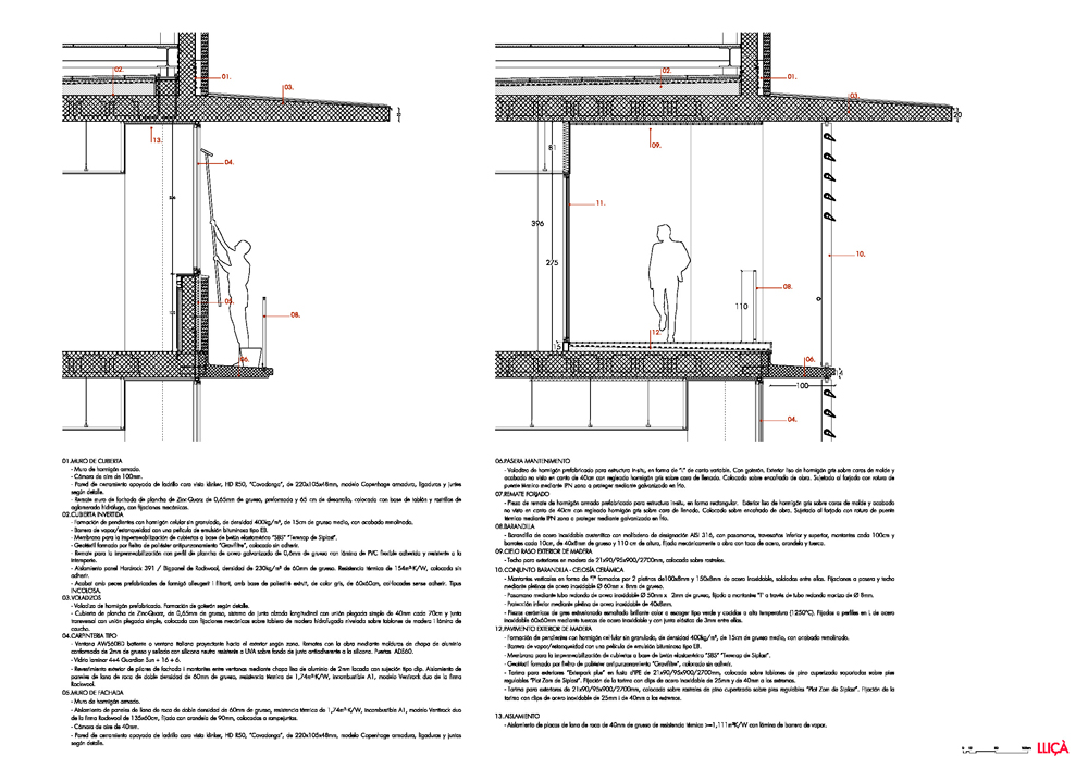 Propuestas de construcción duraderas y con poco mantenimiento: estructura con una trama de 12×8 metros de pilares y muros de hormigón visto en el interior, forjados con placas industrializadas, pavimentos de hormigón pulido, revestimiento exterior de ladrillo klinker, carpinterías de aluminio, protección solar mediante voladizos prefabricados que sirven también como pasarelas de limpieza y mantenimiento y protección de las aberturas con alta insolación mediante lamas de celosía de gres cerámico y cubiertas ajardinadas.