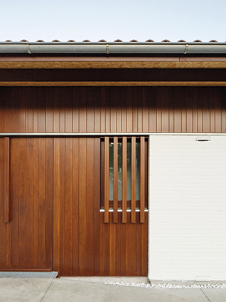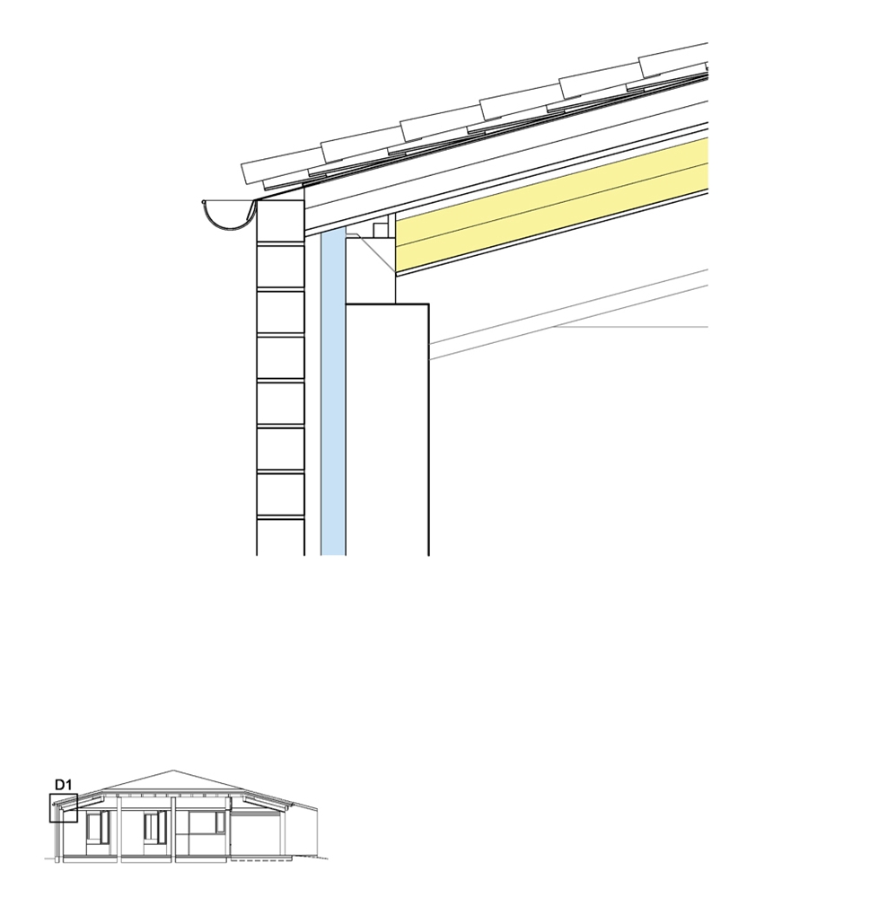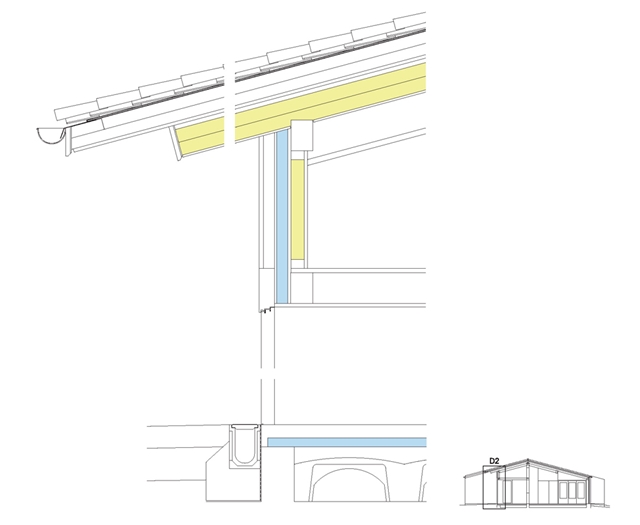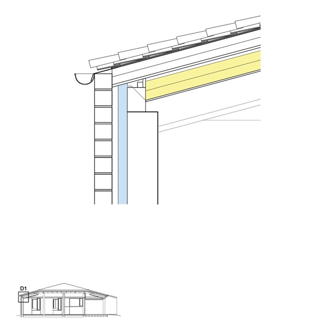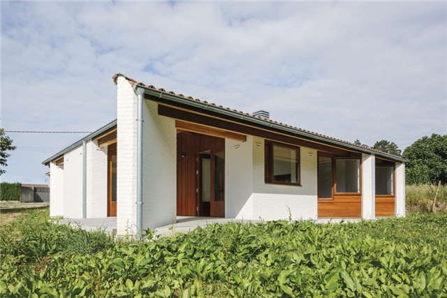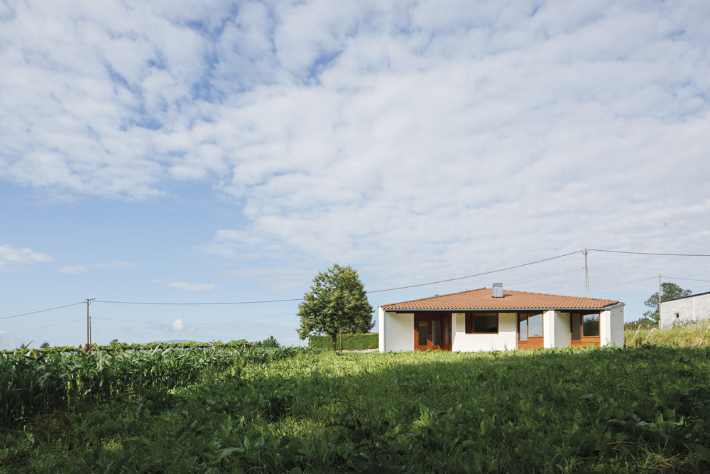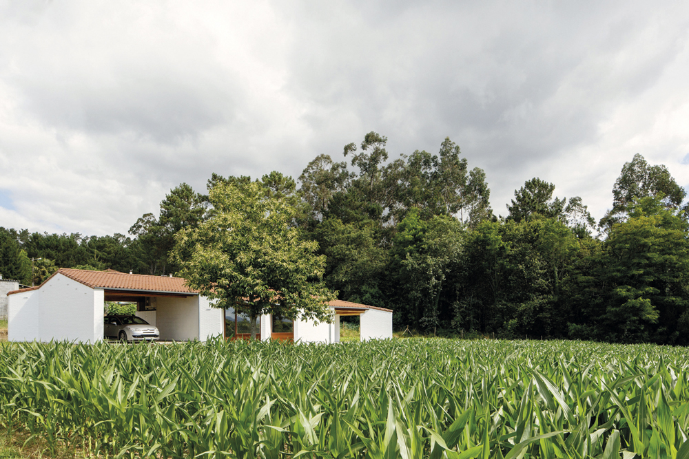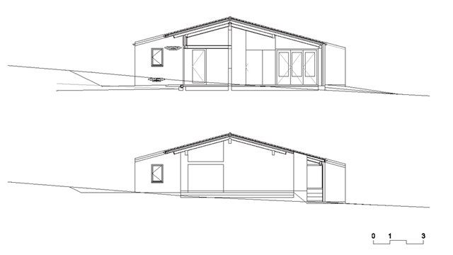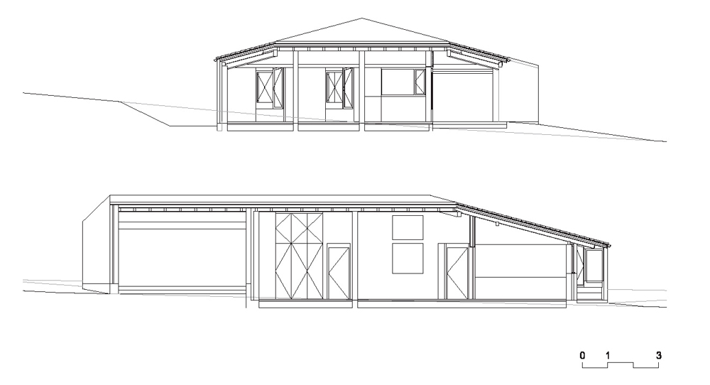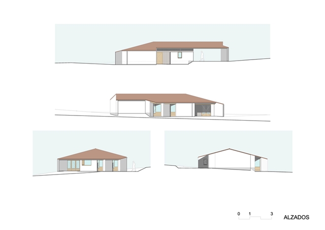 La vivienda se resuelve en una sola planta con una única cubierta a tres aguas que sirve tanto para la parte cerrada como para los espacios exteriores abiertos, incluido el garaje.