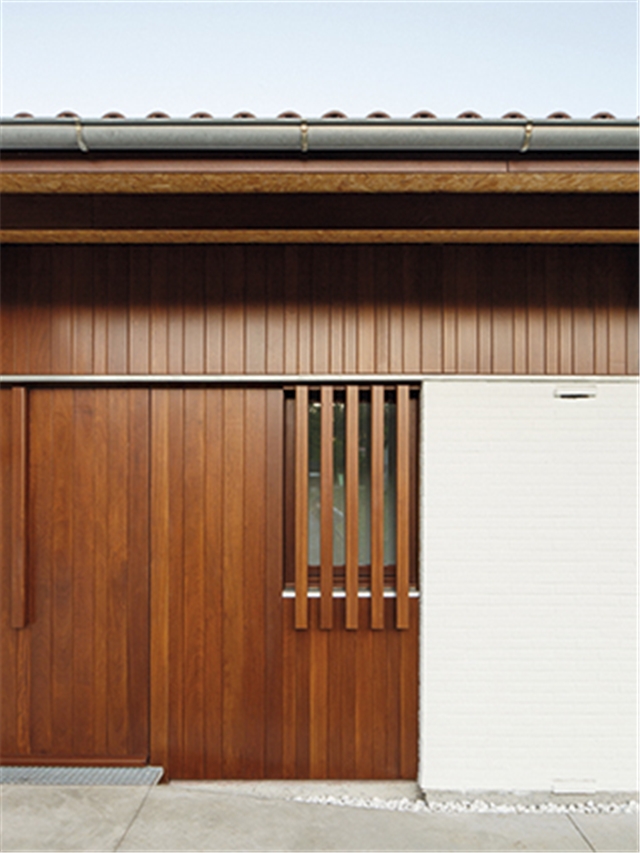 Para los acabados exteriores se ha utilizado un ladrillo de tejar cara vista pintado en blanco en la parte ciega de fachada, madera de iroko con acabado filmógeno traslúcido para la carpintería de huecos exteriores y el entablado de los cerramientos ligeros y teja cerámica curva como material de cubrición para la cubierta. Los canalones, bajantes, alféizares y piezas de remate se resuelven con zinc natural.