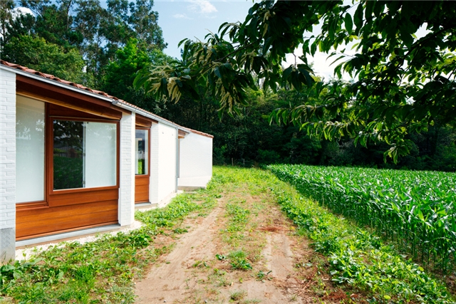El resultado es un único volumen bajo, compacto y anclado al terreno que, desde un punto de vista compositivo, juega con recursos comunes en las construcciones tradicionales (cerramientos pesados con textura rugosa que contrastan con paños de cierre ligero de entablado y carpintería de madera), y desde el punto de vista estructural se resuelve con un sencillo sistema de muros de carga y un armazón de cubierta de madera.