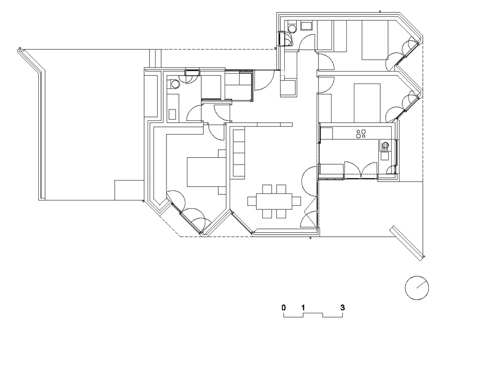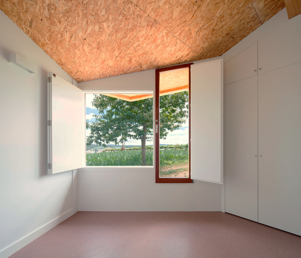 El programa se organiza con todas las estancias en torno a una principal que sirve de estar- comedor y cuenta con la posibilidad de ampliarse abriéndose por completo a un porche (sureste) flanqueado, también, por la cocina. La zona de estar comedor cuenta también con un hueco a sur y a esta misma orientación se abre el dormitorio principal, mientras que la cocina tiene cuenta también con doble orientación y las otras dos habitaciones se adaptan en planta para abrirse al este.