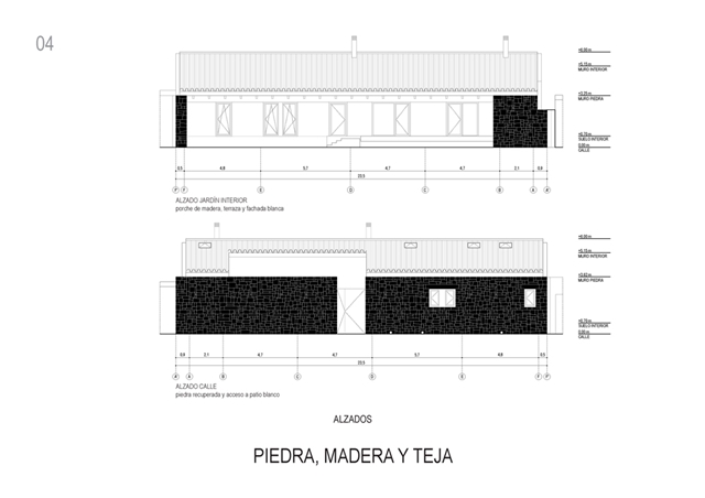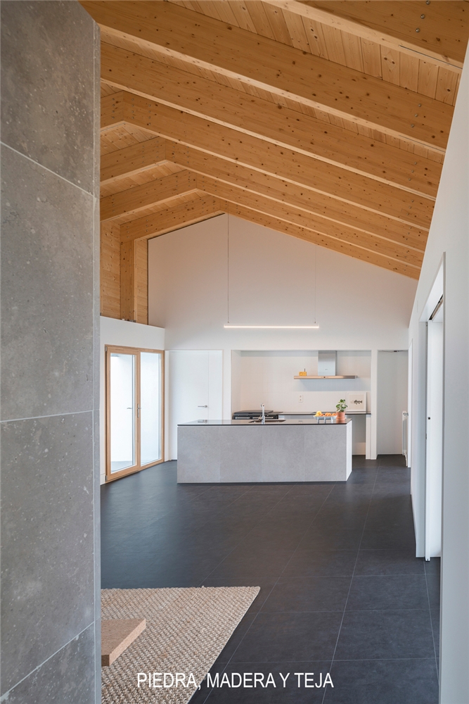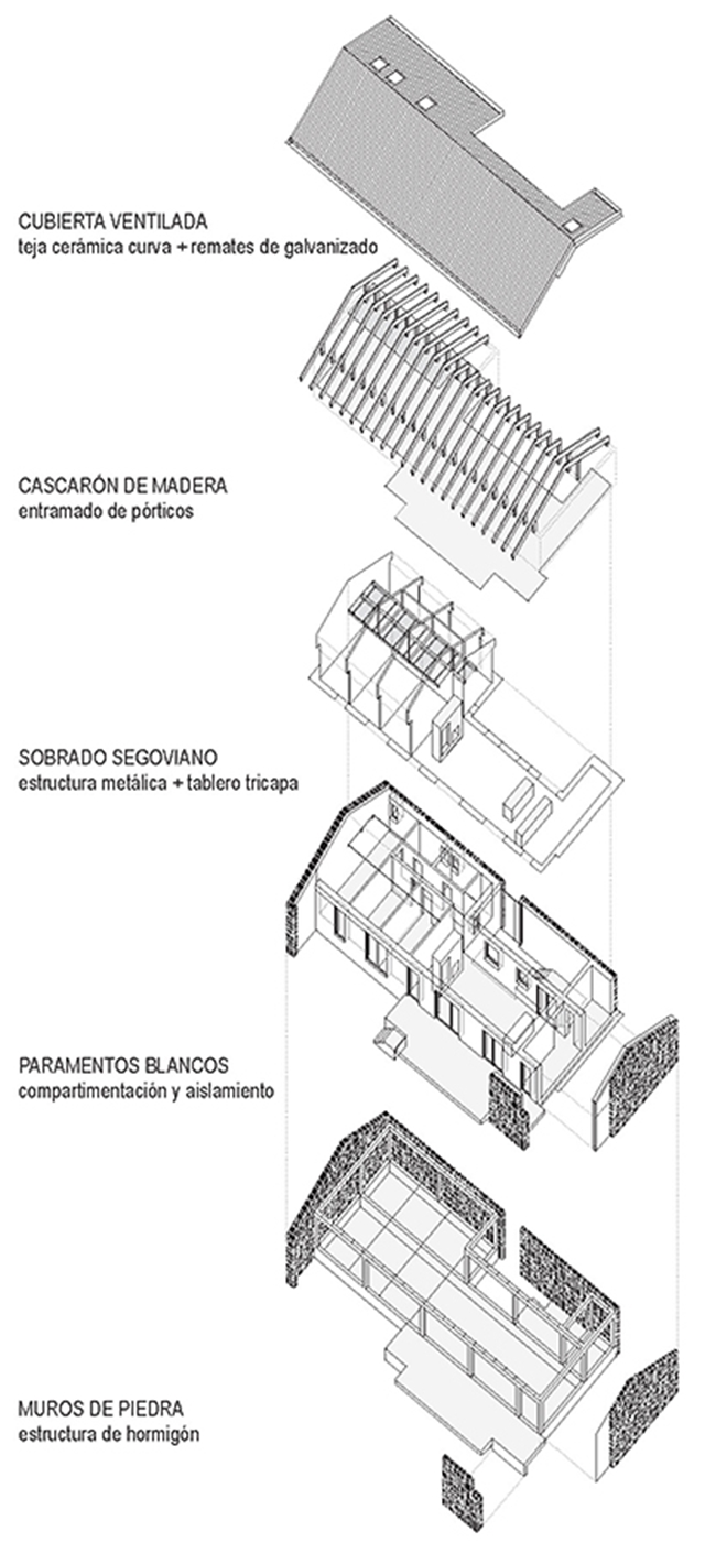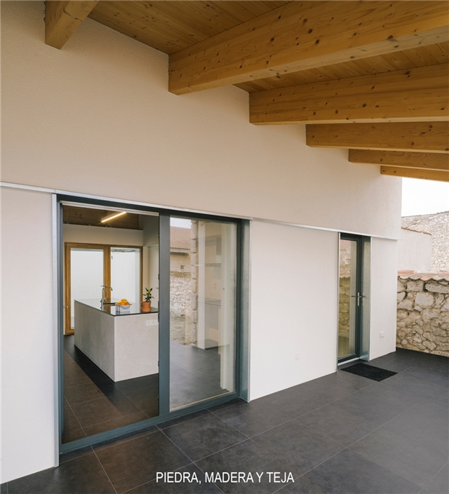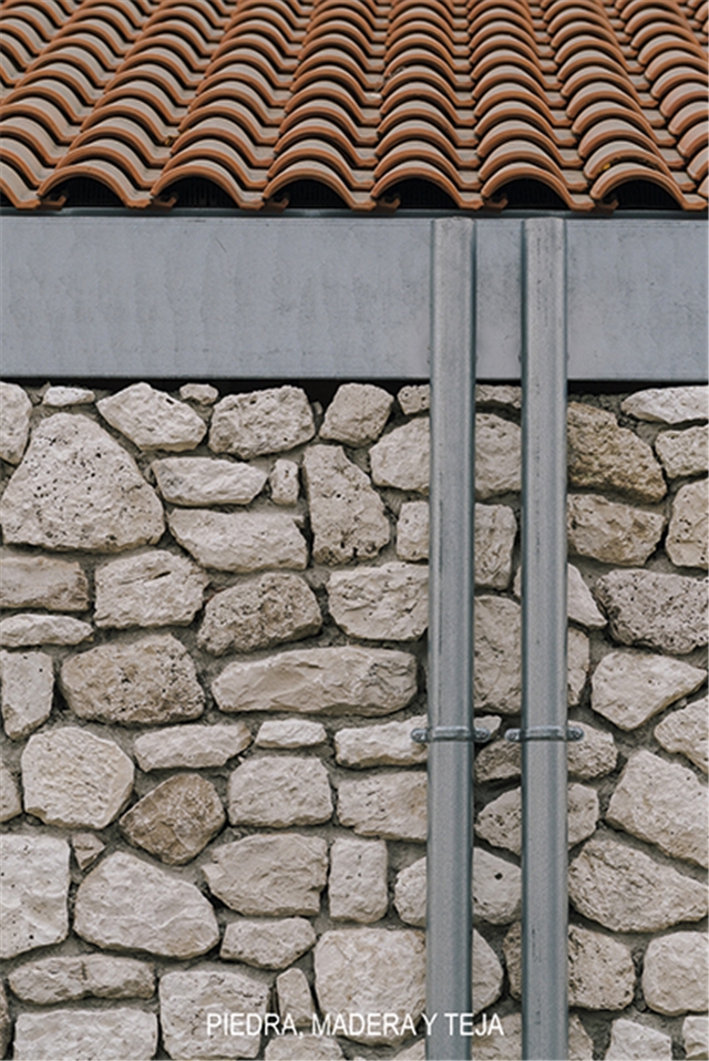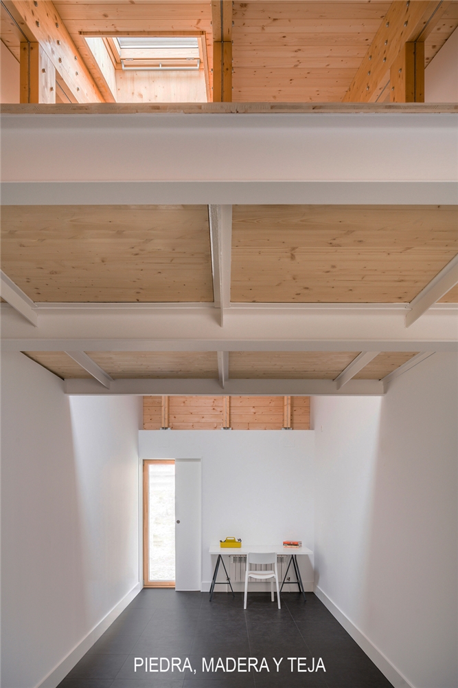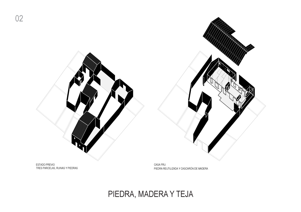 El proyecto reconoce el lugar, el valor del material en ruinas, y desarrolla la vivienda desde la reflexión estructural y constructiva. El plano vividero, elevado sobre el suelo blando del lecho del río, se construye con una retícula de vigas y pilares que definen la cota maestra de apoyo. Sobre esta descansa el cascarón ligero de cubierta, un entramado de pórticos seriados de madera que son ensamblados y montados durante un solo día. La cubierta define geometría, volumen y materialidad interior del espacio doméstico, mientras que al exterior se configura como una cubierta ventilada recubierta por una piel de teja cerámica. La fachada multicapa que envuelve toda la casa recupera la piedra caliza existente para todo el perímetro exterior, mientras que los paramentos que se desgajan formando patio y porche se contrapone un acabado terso blanco.