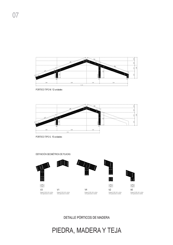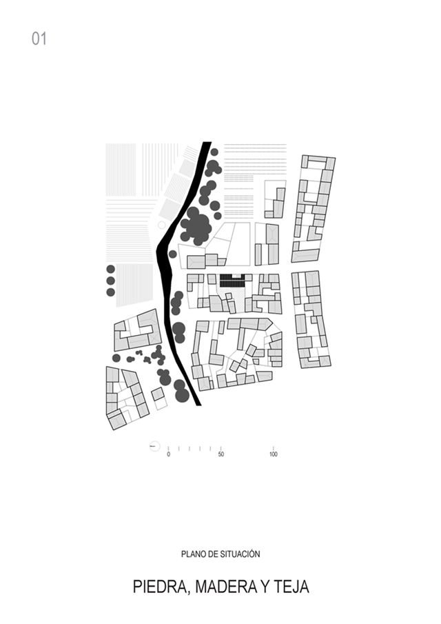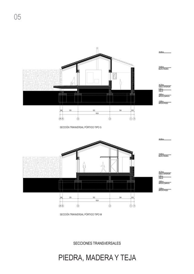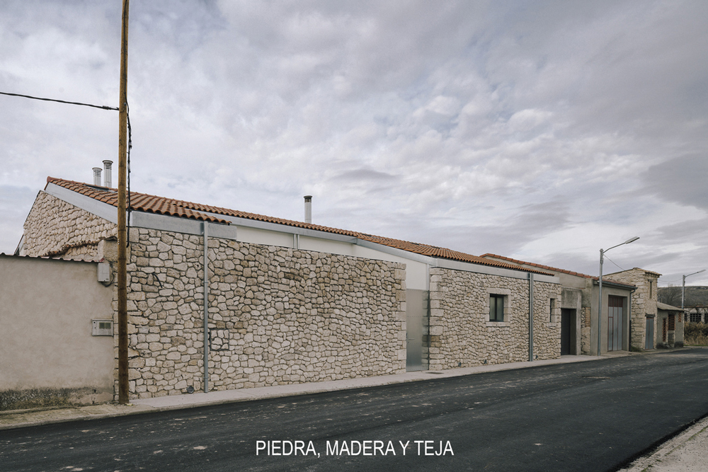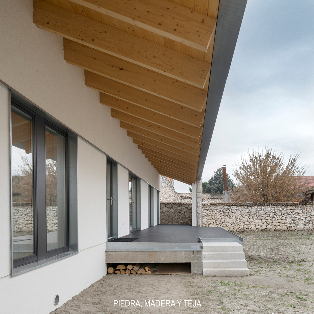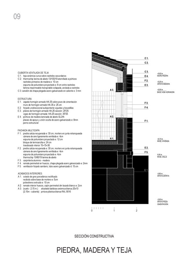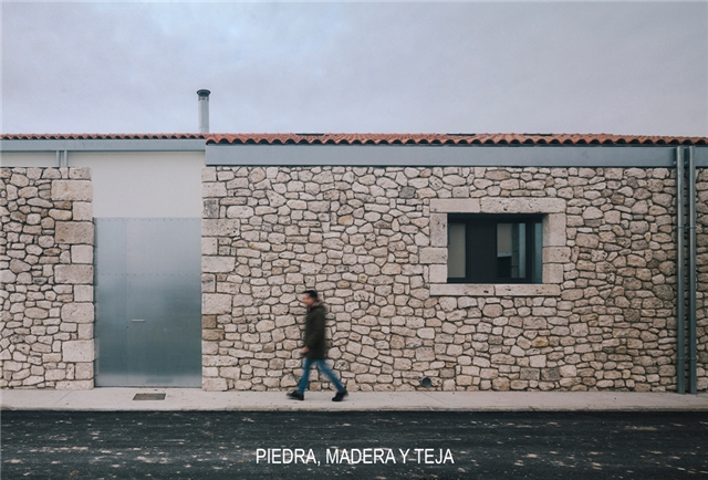 El proyecto reconoce el lugar, el valor del material en ruinas, y desarrolla la vivienda desde la reflexión estructural y constructiva. El plano vividero, elevado sobre el suelo blando del lecho del río, se construye con una retícula de vigas y pilares que definen la cota maestra de apoyo. Sobre esta descansa el cascarón ligero de cubierta, un entramado de pórticos seriados de madera que son ensamblados y montados durante un solo día. La cubierta define geometría, volumen y materialidad interior del espacio doméstico, mientras que al exterior se configura como una cubierta ventilada recubierta por una piel de teja cerámica. La fachada multicapa que envuelve toda la casa recupera la piedra caliza existente para todo el perímetro exterior, mientras que los paramentos que se desgajan formando patio y porche se contrapone un acabado terso blanco.
