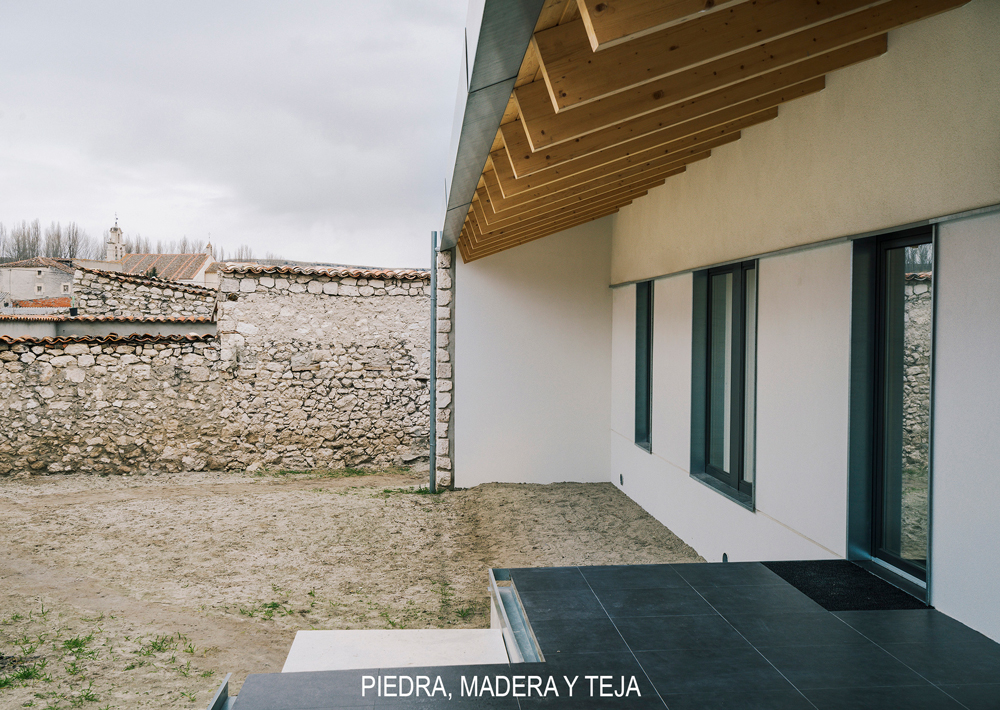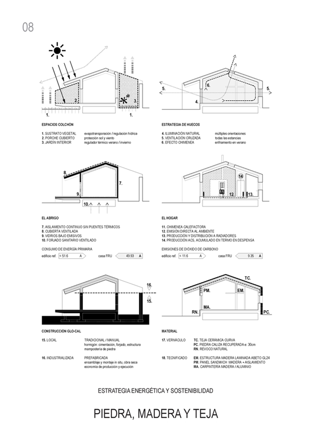 Frente a la dureza climática de la meseta castellana implementamos las estrategias tradicionales, activas y pasivas, que permiten lograr una calificación energética A. La vivienda se recubre con un aislamiento generoso, eliminando los puentes térmicos y conformando unos cerramientos de gran inercia que aprovechan la oscilación térmica día/noche. La altura de techo junto con la disposición de huecos facilita la ventilación cruzada o el efecto chimenea según la estación. Un hogar central produce y distribuye calor a toda la vivienda durante los meses fríos.