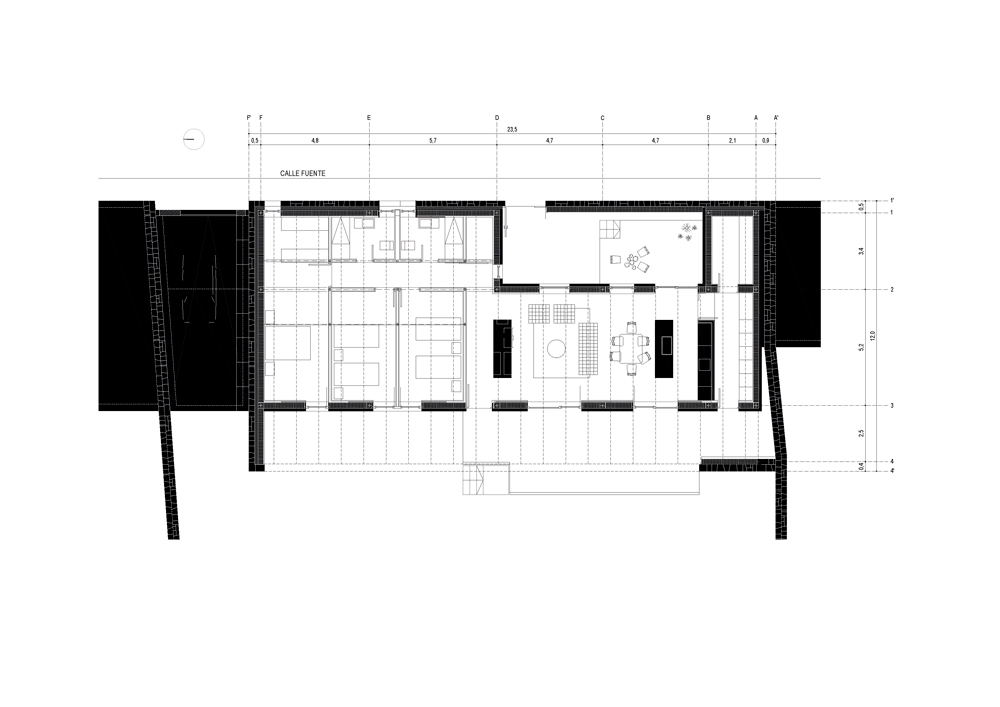 El interior no deja de ser una nave genérica, una estructura flexible matizada por el programa. A la calle la vivienda se fortifica, con una franja ocupada por zonas de servicio y almacenaje. La sección se acota en las habitaciones introduciendo un sobrado segoviano, y el porche continuo prolonga las estancias al jardín. La ubicación estratégica de los huecos enmarca las vistas y configura un interior dinámico con múltiples orientaciones y matices de luz. La secuencia espacial que proporcionan patio, porche y jardín permiten tejer interior con exterior, creando espacios intermedios, ámbitos protegidos al aire libre y dotando al conjunto de vistas cruzadas, transparencias y reflejos.