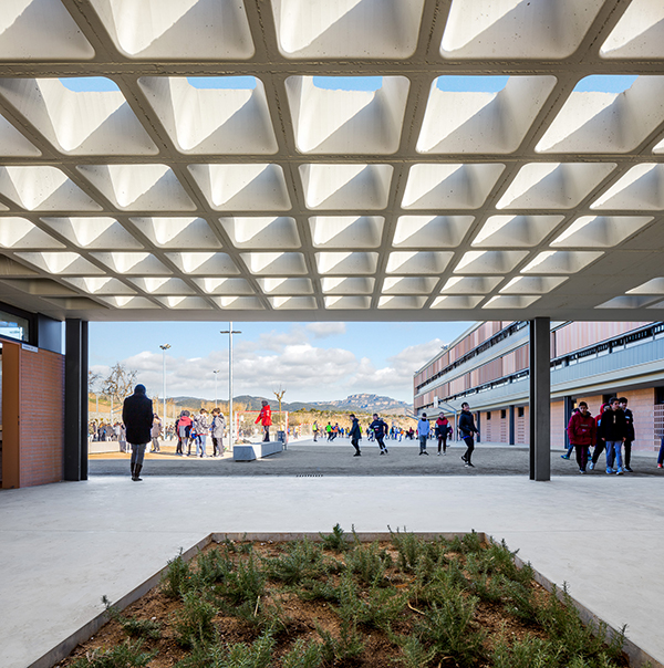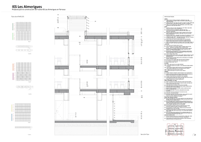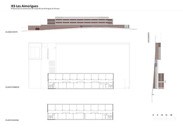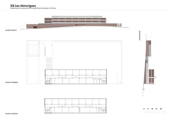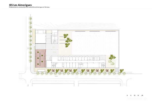 El nuevo Instituto Les Aimerigues se sitúa en una parcela al límite del tejido de viviendas en el sector de las Aimerigues, en el umbral de un futuro crecimiento de ciudad y un área de parques de importantes dimensiones limitados por la calle de Icaria. La implantación se define desde la ubicación de los volúmenes dentro de la parcela: un volumen compacto alineado en la calle consolidada de Pablo Iglesias y un volumen menor que contiene el gimnasio y que define el acceso a través del espacio público y el porche.