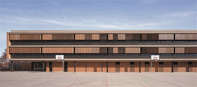 Se disponen las aulas en el volumen alineado a la calle Pablo Iglesias, formalizando una de las vallas del centro sin generar espacios residuales. El gimnasio se dispone dando frente a la calle de Icaria, acompañando el acceso, con un primer espacio arbolado que servirá para aparcamiento de bicicletas. Entre los dos volúmenes se genera un porche a través del cual se accede al instituto y al gimnasio.