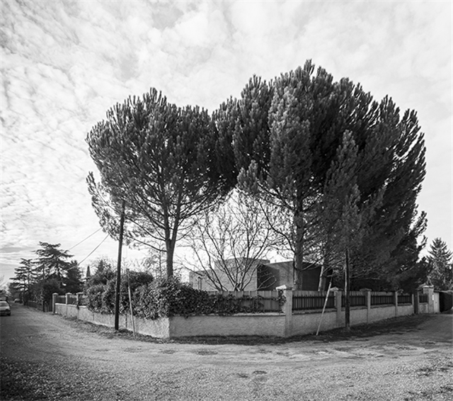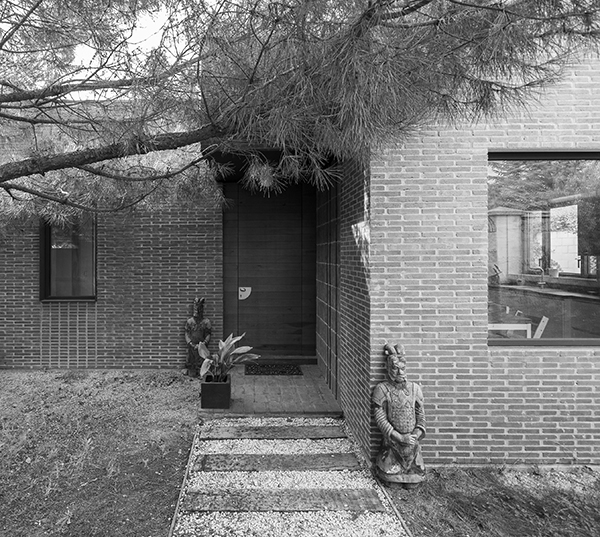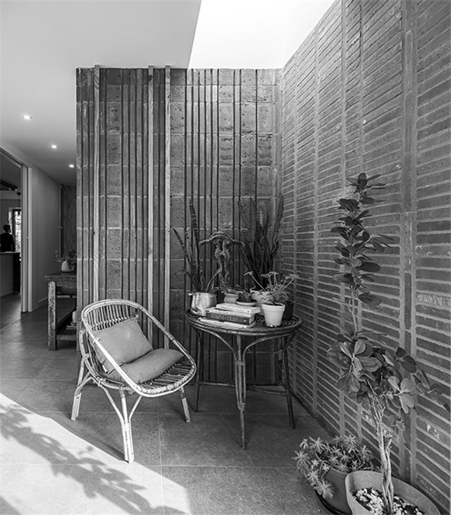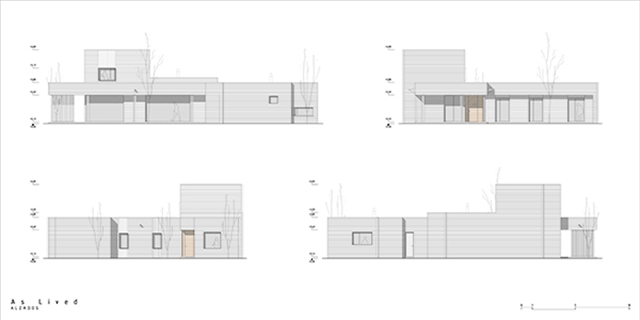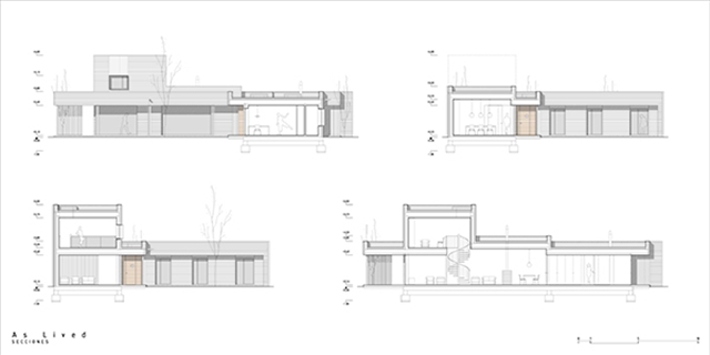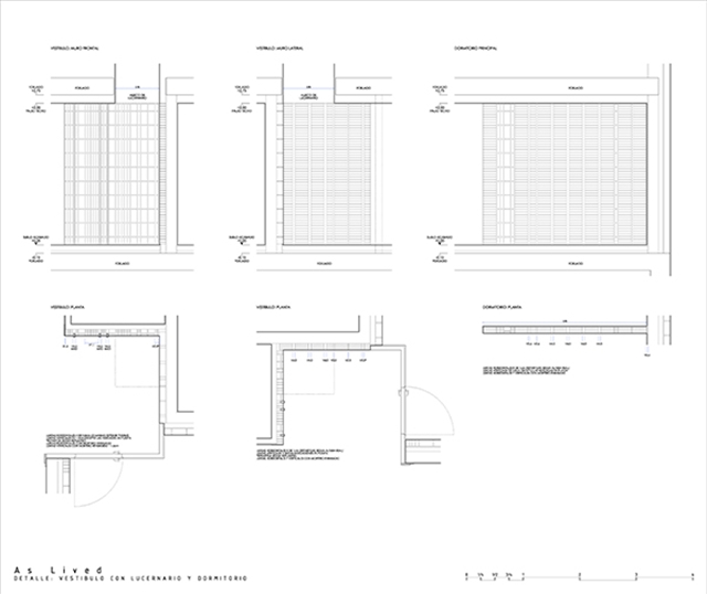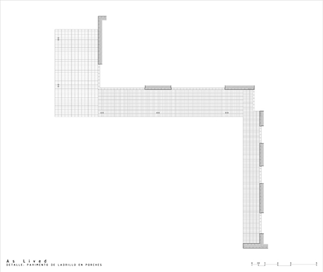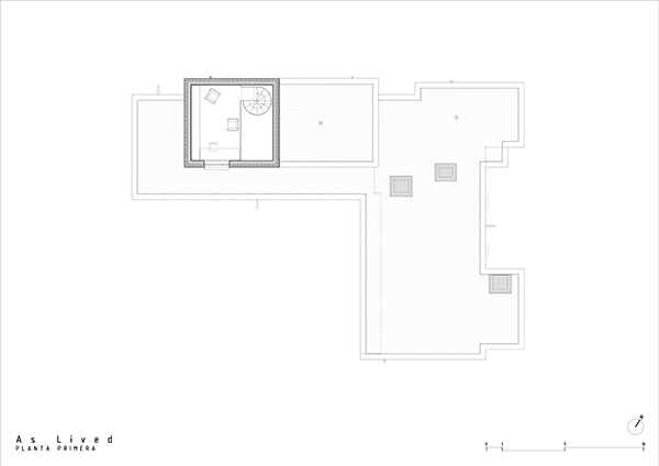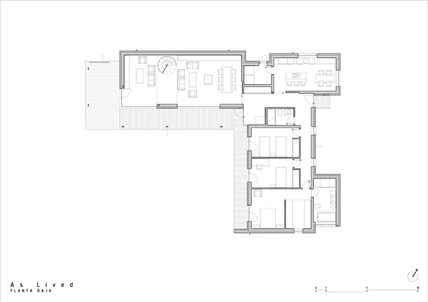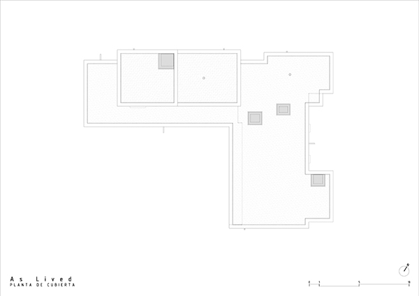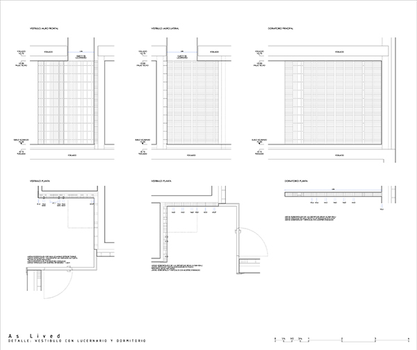 Desde el patio, la vivienda se presenta abierta, unitaria y protegida por los vuelos y sus sombras; desde el resto del perímetro, la vivienda aparece como cerrada, fragmentada y discontinua, con una serie de desplazamientos, entrantes y salientes que definen pequeños ámbitos.