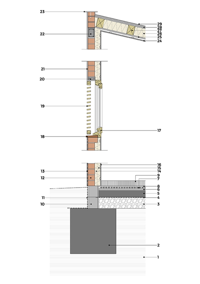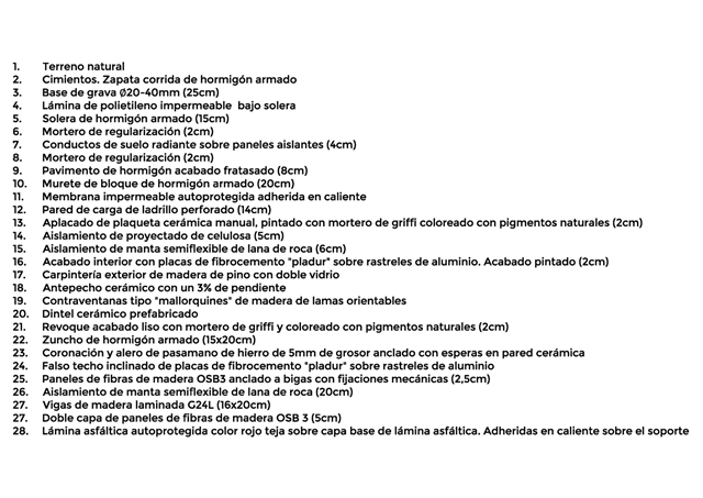 La sostenibilidad de la vivienda se complementa con el uso parcial de sistemas prefabricados, el aislamiento ecológico con celulosa proyectada, la madera, la cerámica manual y otros elementos que tienen un menor impacto en su ciclo de vida y huella ecológica.