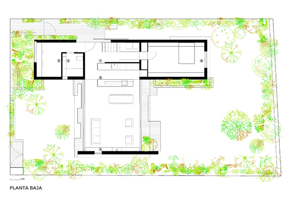 Tectónica y texturas / Para el volumen horizontal una sucesión de planos de transparencia, entre el parque frente a la casa, el jardín delantero, el espacio de estar y el patio trasero.