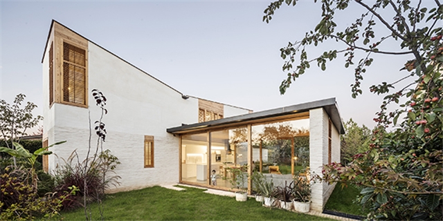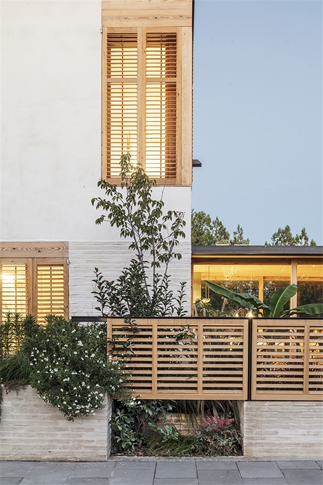 Para el volumen vertical, el revoco liso color marfil superior, el ladrillo manual pintado con el mismo mortero y las persianas de lamas de madera conforman la envolvente, con fragmentos de sutiles texturas que van definiendo los volúmenes de este cuerpo.