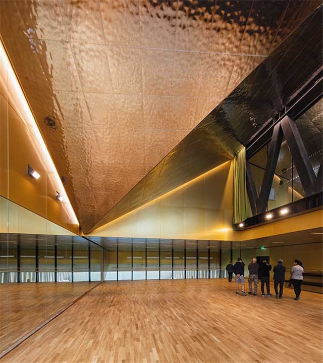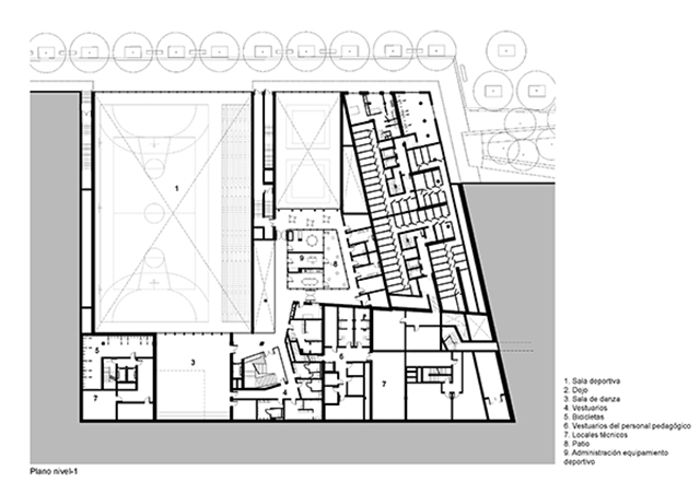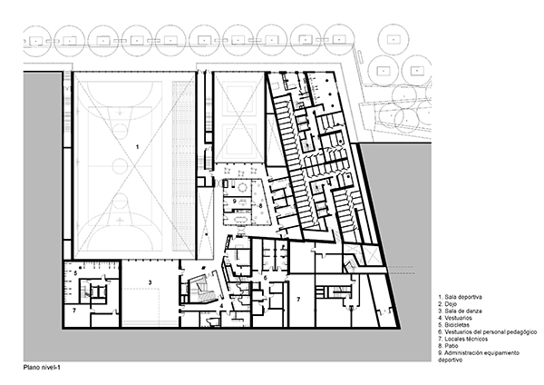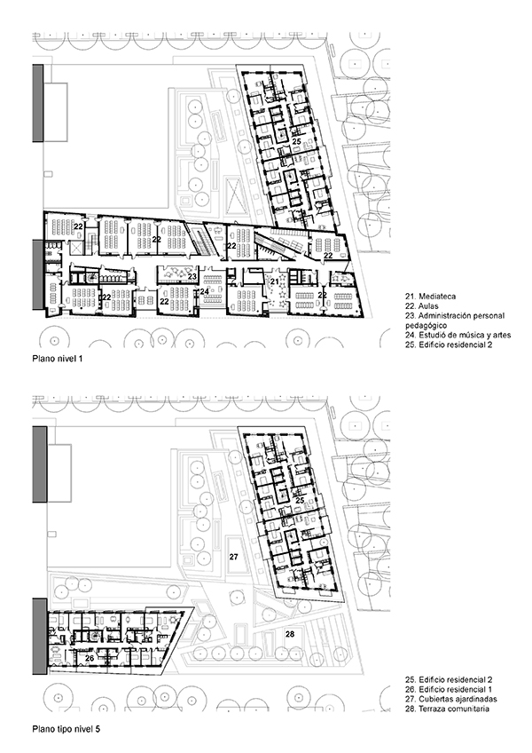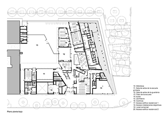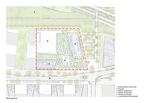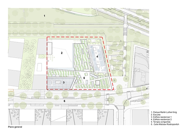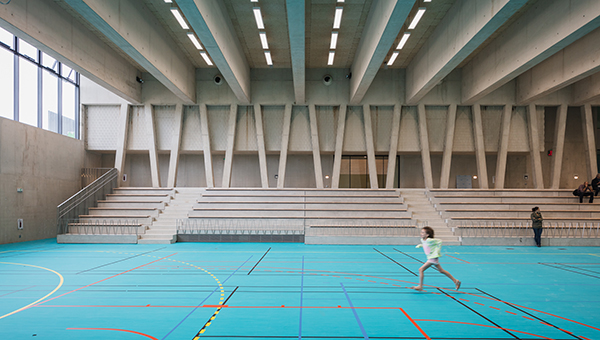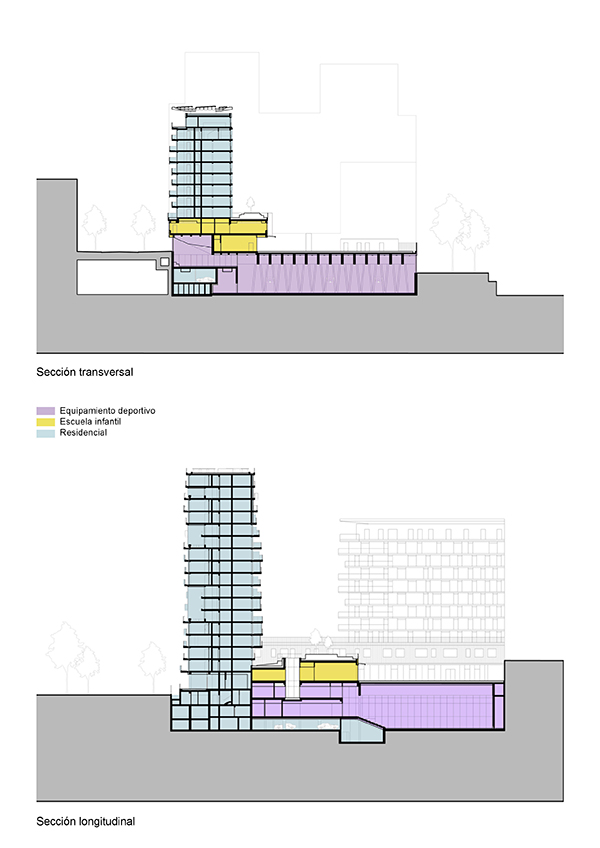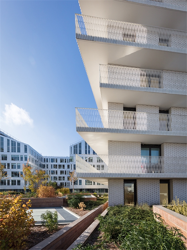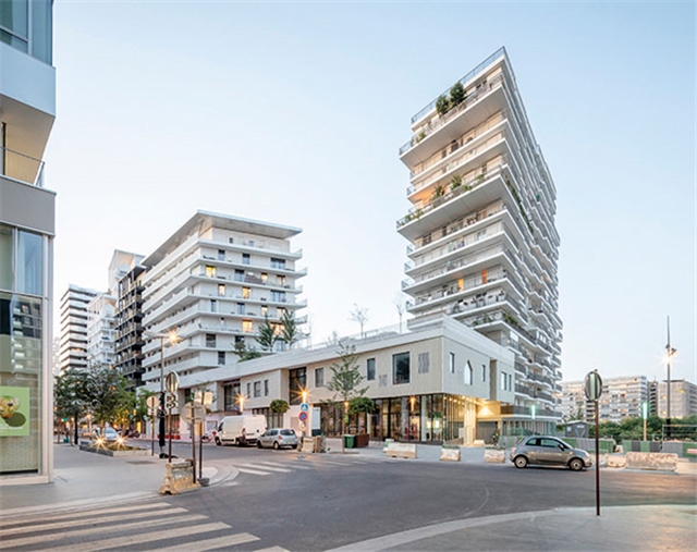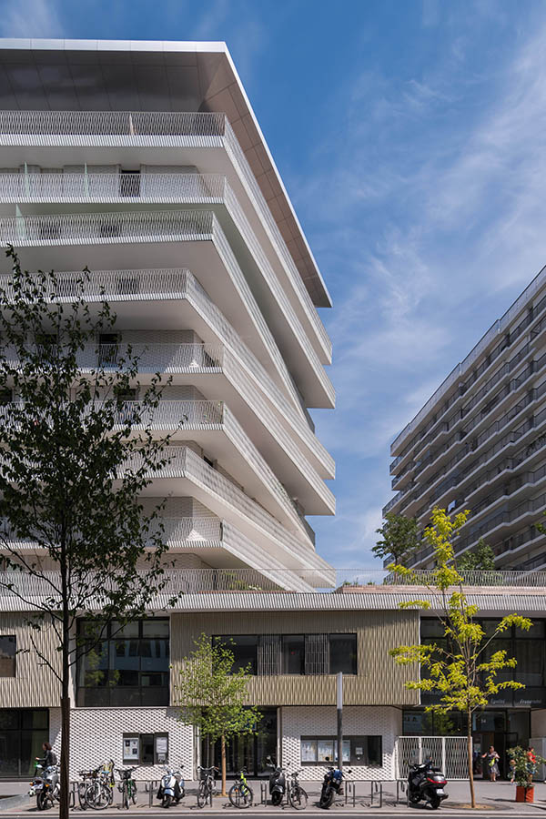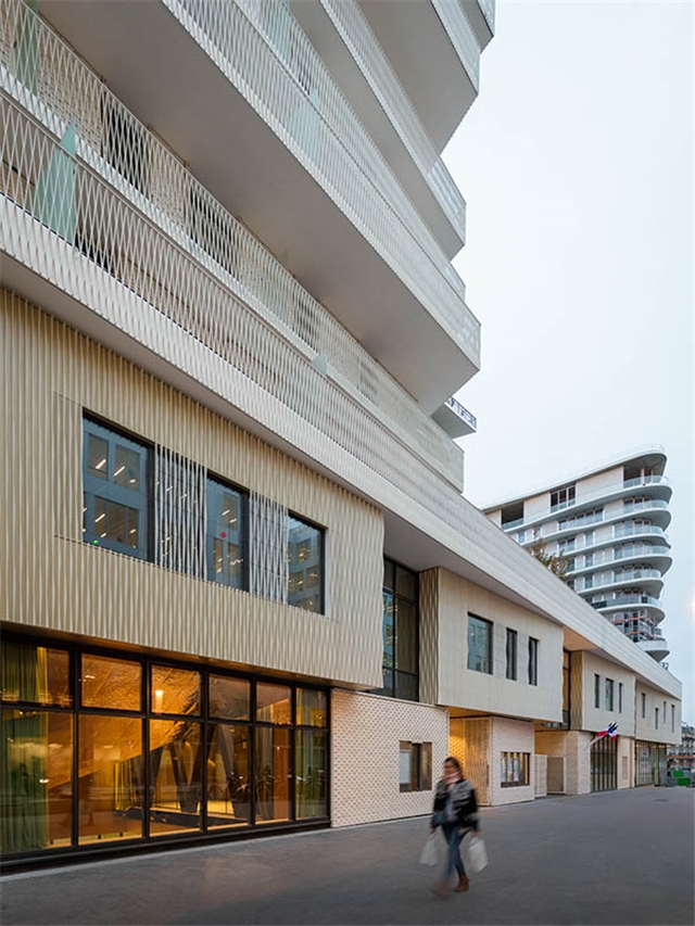 A lo largo del nuevo bulevar, una gran cantidad de grandes ventanas en un edificio de dos pisos revelan las diferentes actividades: vivienda, educación, deporte y comercio. Sobre la base, un edificio de nueve pisos contiene diferentes unidades de apartamentos que van desde estudios hasta dúplex de cuatro habitaciones en los pisos superiores. Una terraza compartida conecta los dos edificios.