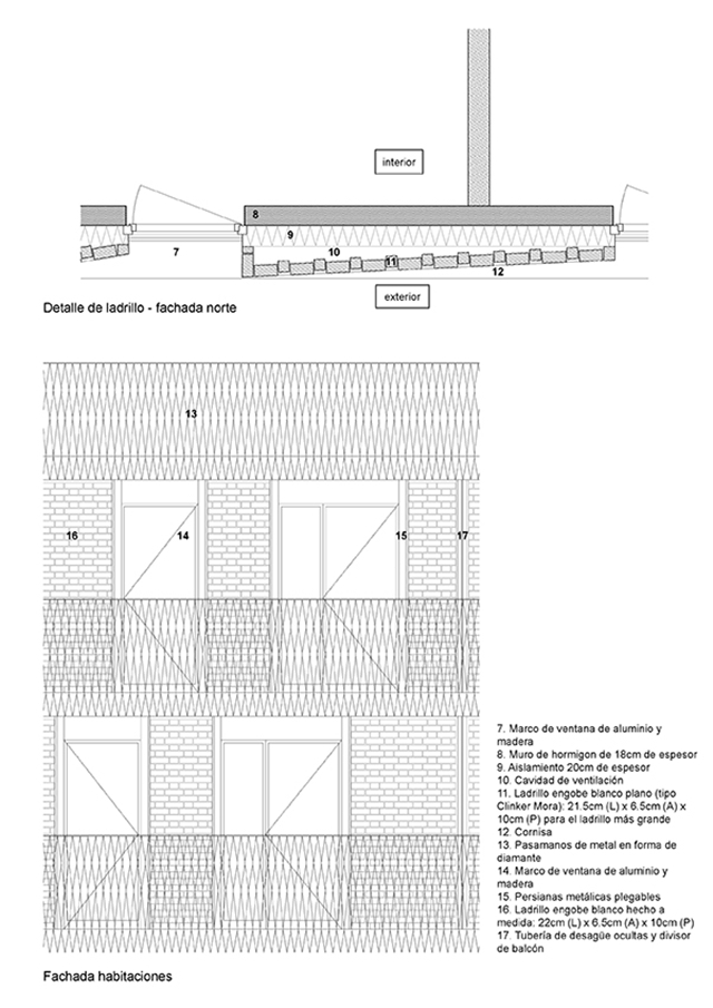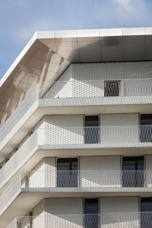El revestimiento de la fachada del bloque de viviendas está hecho completamente de ladrillos tradicionales, modelo clínker mora blanco fabricados por Mora Cerámicas, con un patrón diseñado para crear un grano fino visible desde la calle.