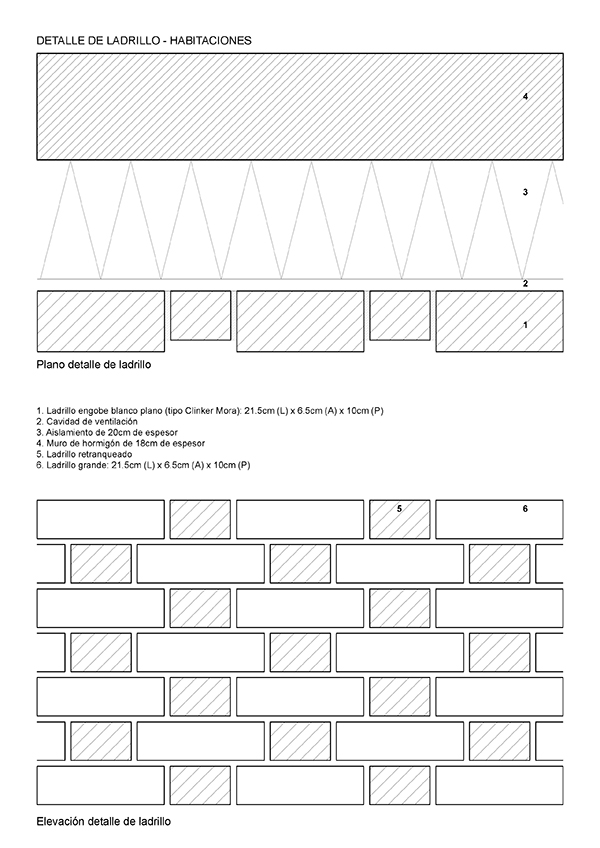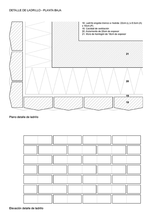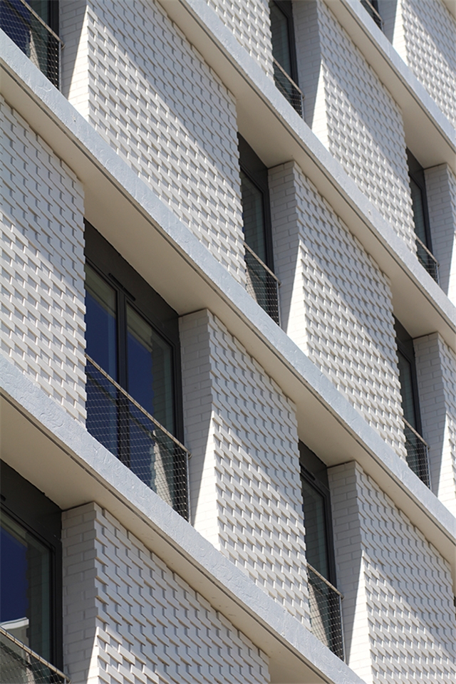 Las sombras proyectadas sobre los ladrillos engobe blanco plano retranqueados crean un patrón similar a un efecto de forma de panal. El tono blanco del mortero fue elegido para enfatizar el patrón de colocación de los ladrillos en lugar de la naturaleza individual del material.