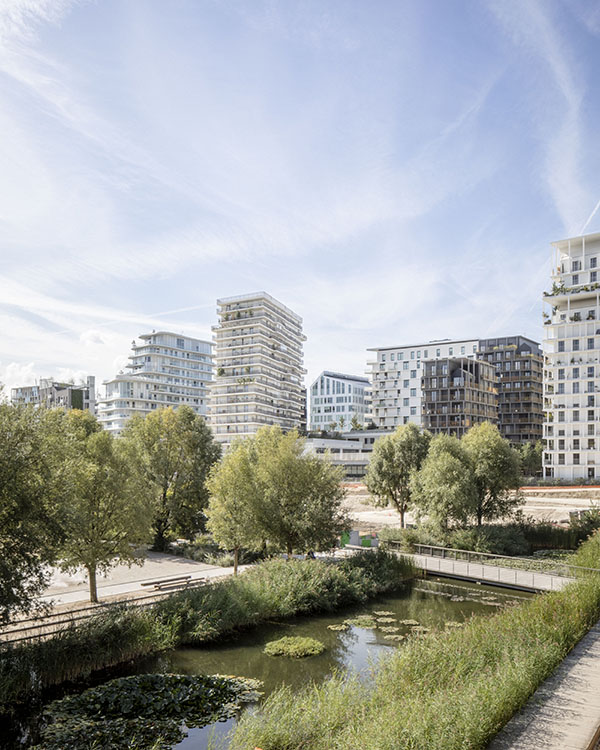Dentro del plan maestro de Clichy-Batignolles, en un sitio muy estrecho entre el denso tejido urbano y un parque expansivo, se crea un proyecto de uso mixto de extrema claridad y distinguida resolución de detalles y materiales a partir de los exigentes requisitos programáticos del cliente.