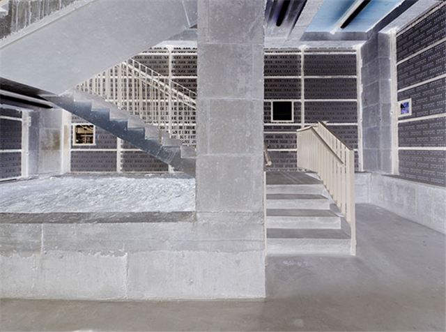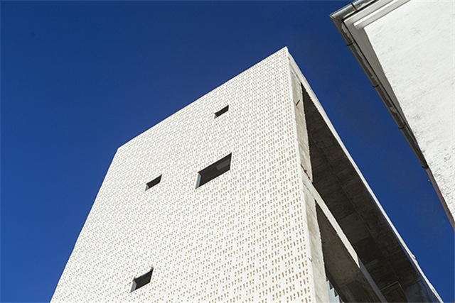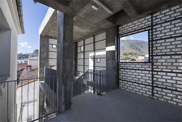 Este nuevo volumen exterior, que se separa de la edificación preexistente, se formalizará con una estructura de hormigón armado con pilares apantallados. El esqueleto de hormigón resultante se cubrirá con una piel cerámica configurando un cerramiento continuo a modo de celosía. Esta celosía cerámica contendrá una serie de aperturas que permiten establecer diferentes conexiones visuales hacia el paisaje exterior durante el recorrido a través de las escaleras.