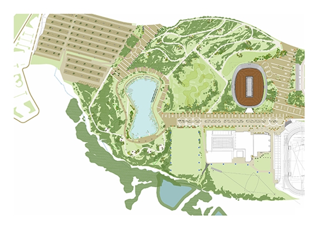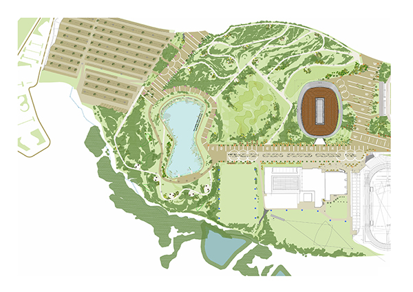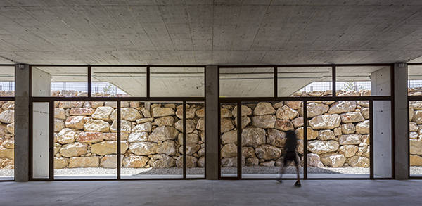 En la fachada sur del edificio se produce el acceso habitual; este acceso resolverá el funcionamiento diario. El acceso exclusivo para grandes eventos se realizará desde la fachada norte. Se modifica la topografía del entorno inmediato, apareciendo una zona semienterrada que contiene parte del programa suavizando la presencia del edificio. Esta modificación mejora la inercia térmica y la eficiencia energética. La aparición de patios ingleses permiten la entrada de luz natural y ventilación.