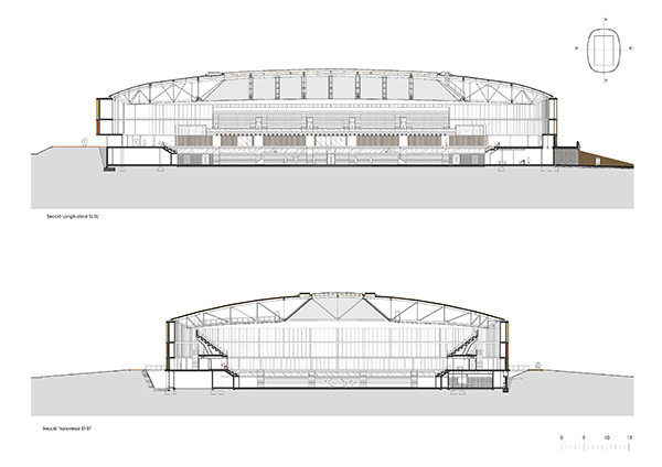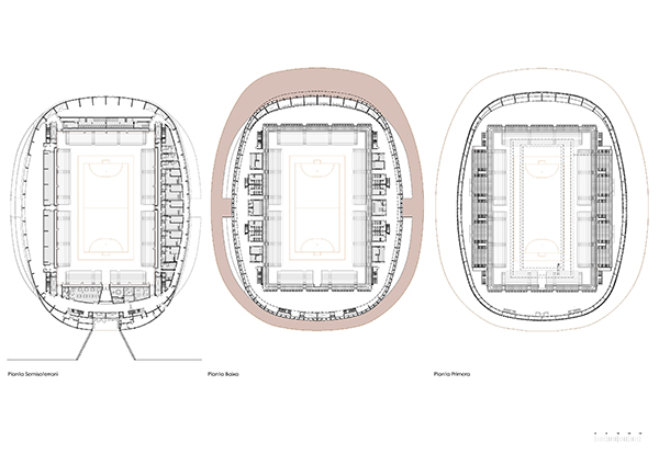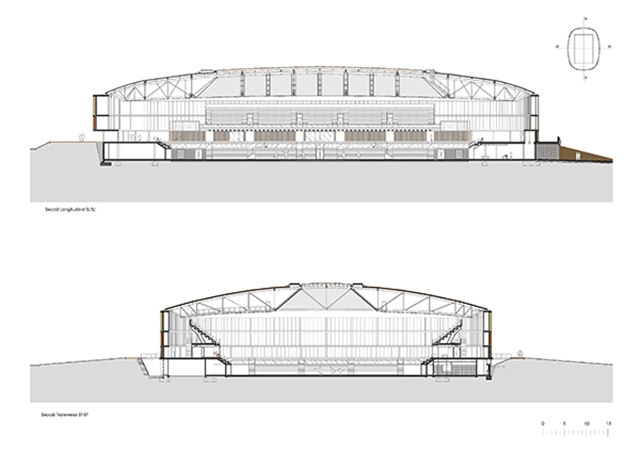 El edificio se resuelve en un único volumen que se desarrolla en dos niveles. Su dimensión viene determinada por la medida del espacio central, que permite albergar 3 pistas de 44×22 m de forma contigua. El espacio destinado al público, situado en la planta de acceso, permite controlar visualmente el recinto y establecer una relación visual con el entorno. En el nivel inferior se sitúan los vestuarios, administración, prensa, deportistas e instalaciones. En el nivel superior se sitúan los espacios del público, servicios, restauración, sala de prensa y autoridades.