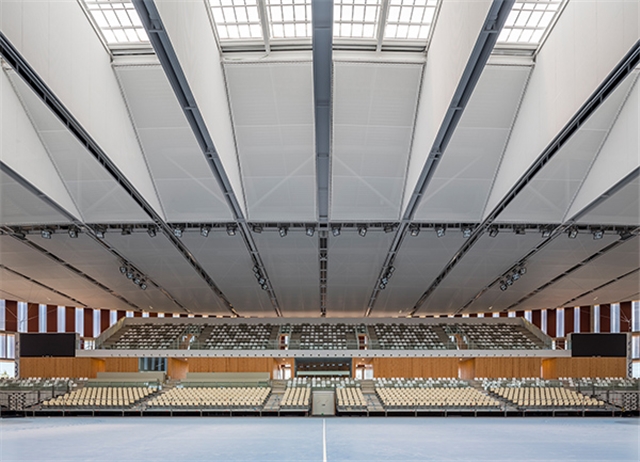 El acabado de cubierta se resuelve mediante piezas cerámicas de 30x30cm que forman una cámara de aire ventilada y van colocadas en seco con el sistema de malla de acero flexbrick, formada por láminas de 1,2×10 metros, unidas entre ellas, lo que permite una adaptación idónea a la geometría de la cubierta. En la zona central se sitúa un lucernario permitiendo la iluminación natural de las pistas y su oscurecimiento mediante lona móvil; la geometría del falso techo y el lucernario tamizan la luz y actúan de difusores acústicos.