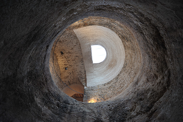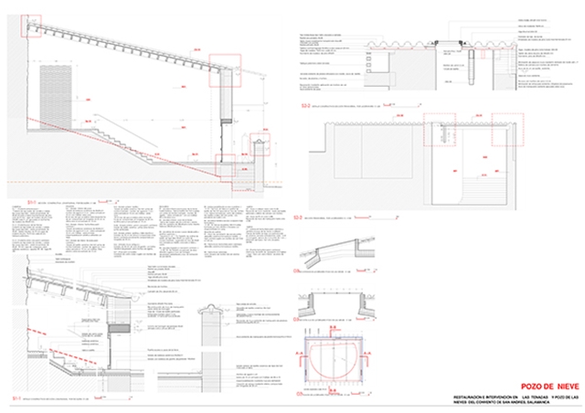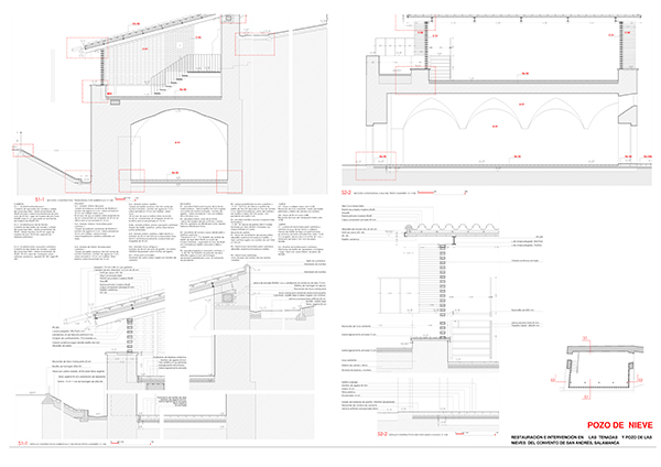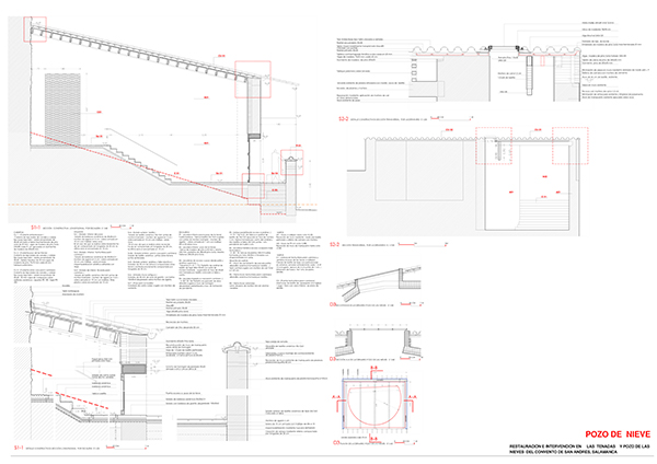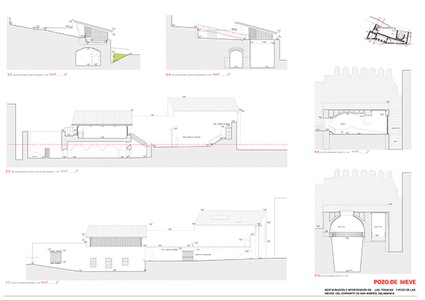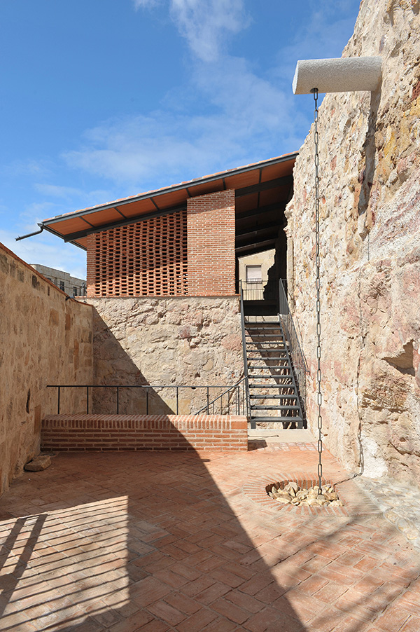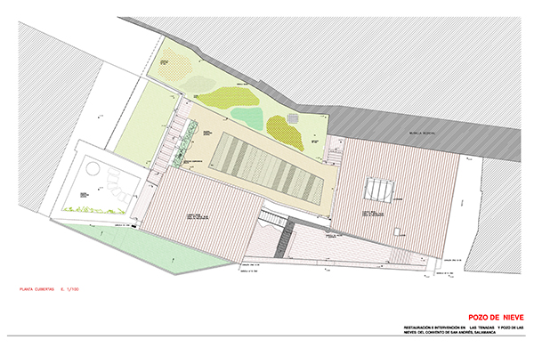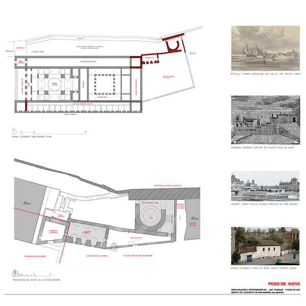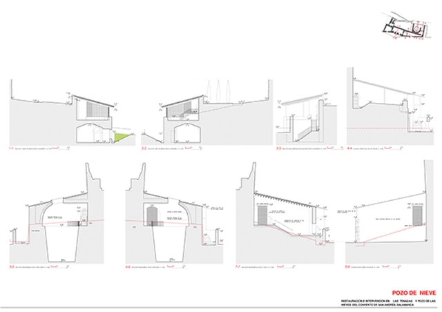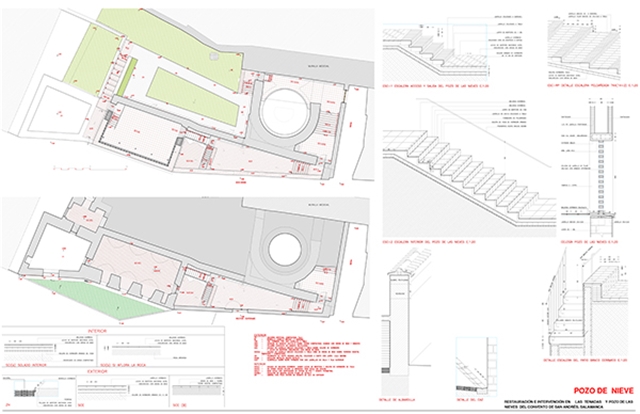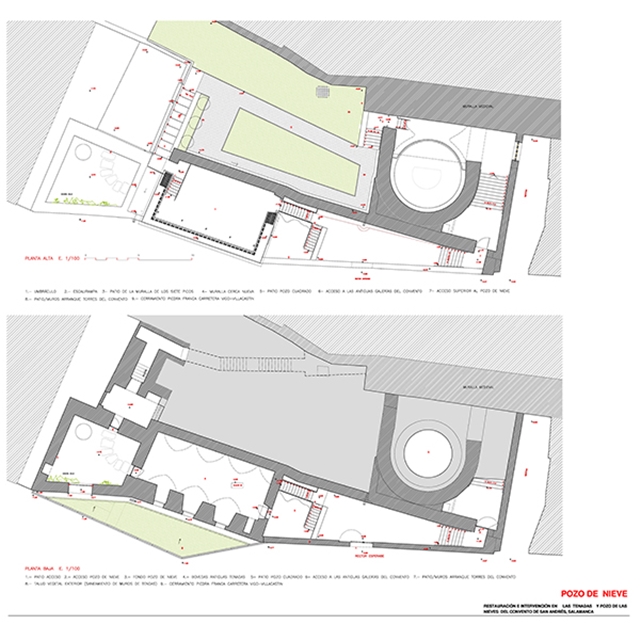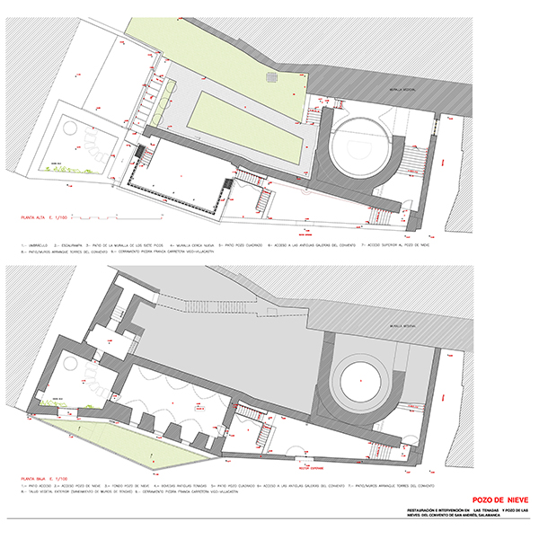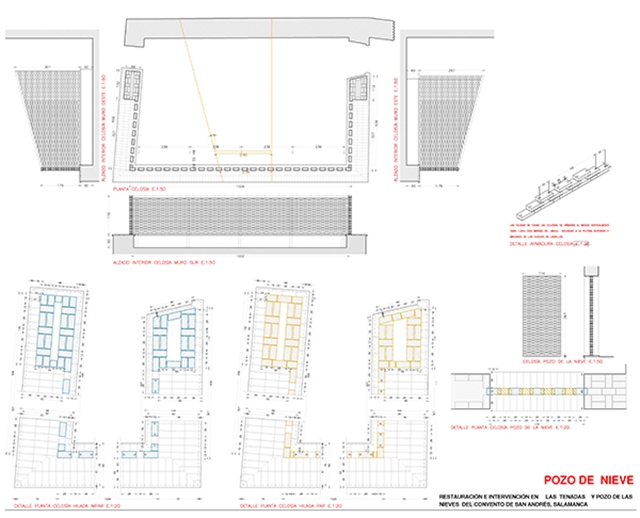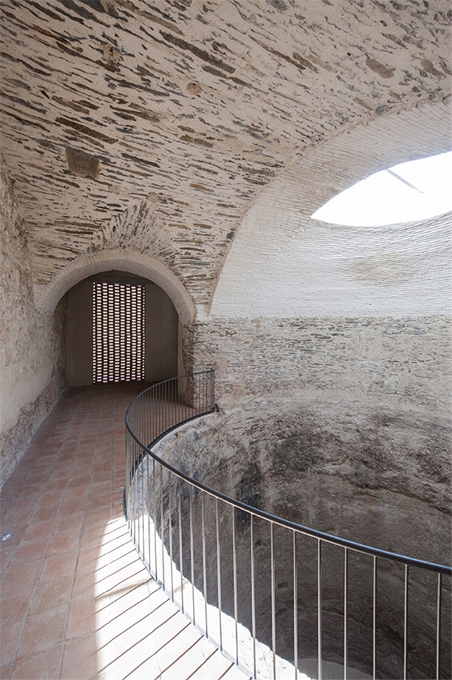 En el pozo de nieve se ha recuperado el espacio de acopio, restaurado los paramentos y bóvedas, presididas por la luz cenital, mientras que el acceso original ha quedado señalizado mediante una celosía de ladrillo, que permite la entrada de una tenue luz difusa, y minimiza el impacto del edificio moderno colindante.