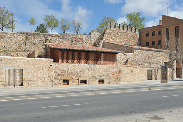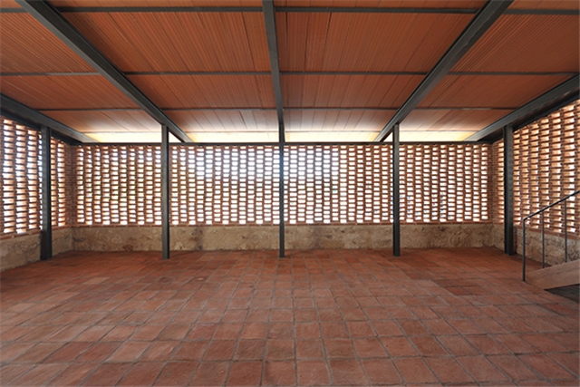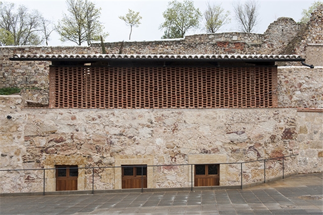 En el edificio de “oficinas” se planteó la recuperación de la volumetría histórica, aunque al haber desaparecido completamente los muros de mampostería originales, carecía de sentido la reproducción mimética del cuerpo alto. Por esta razón se opta por delimitar el espacio mediante una celosía neutra de ladrillo que define la traza mientras crea sutiles efectos de luz y sombra, quedando protegida con una cubierta de teja a un agua similar a la original, y que se manifiesta en su cara inferior mediante similar material.