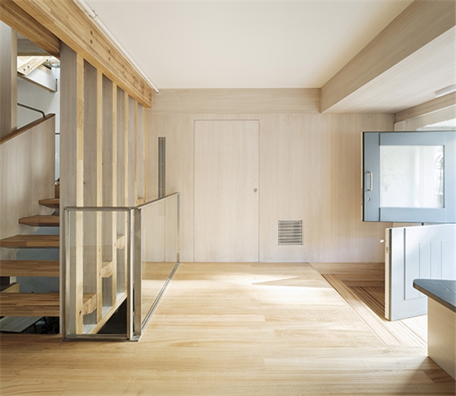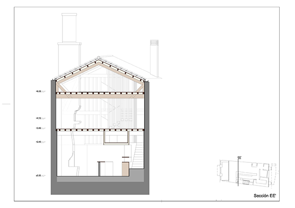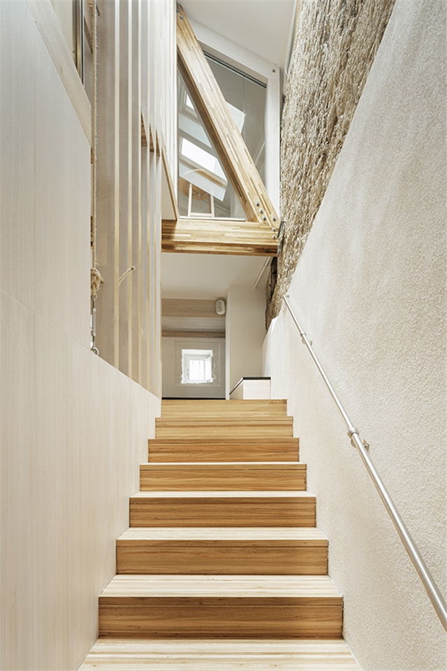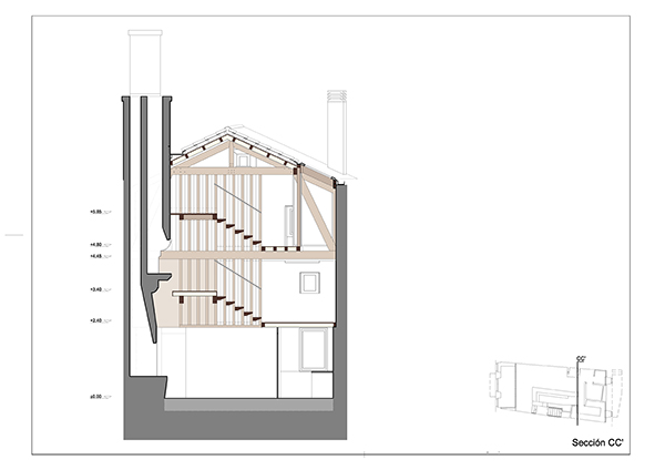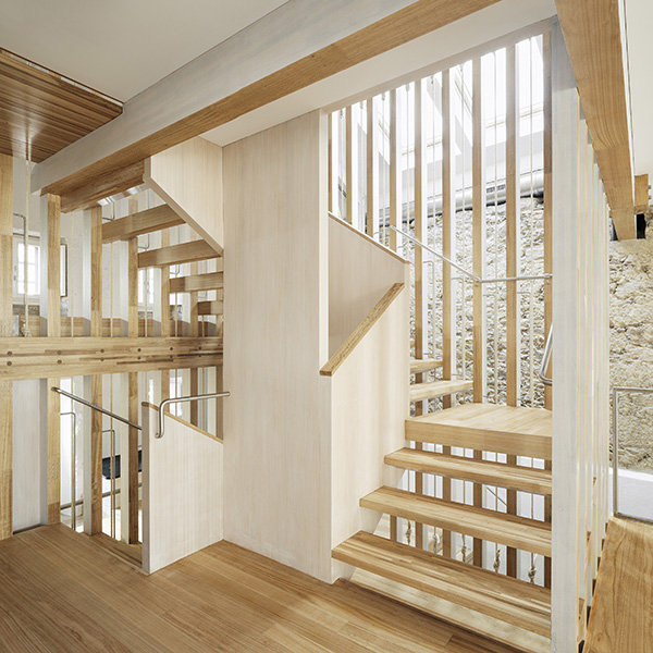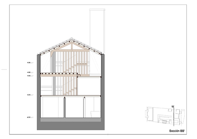 El encuentro entre los diferentes niveles de piso se resuelve con una cercha de madera laminada sobre la que descargan, directamente o a través de tirantes, parte de los forjados y de la escalera.
