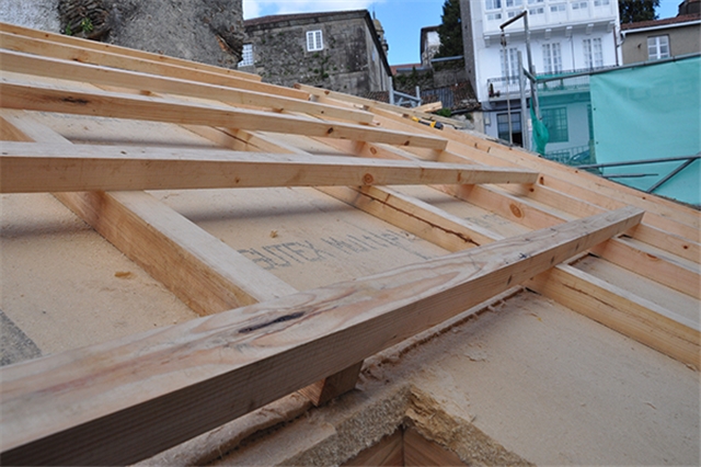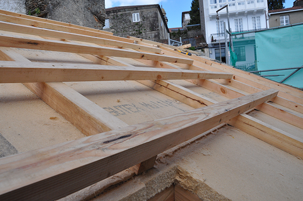 Los nuevos elementos constructivos y estructurales resueltos en madera de eucalipto laminado se presentan “en crudo”. Se reaprovechan los tablones de madera aserrada de castaño que, a pesar de sus grandes dimensiones y del prolongado abandono de la edificación, se conservaban en buen estado y no habían sufrido deformaciones.
