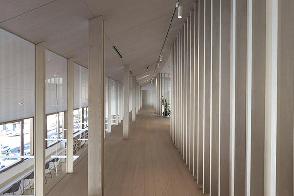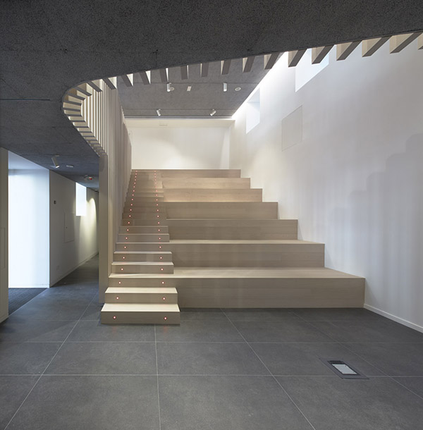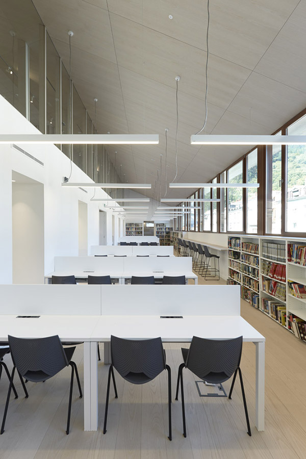El edificio se abre a la plaza desde el pórtico de acceso y hacia el interior en el vestíbulo como prolongación del espacio público que coloniza el edificio a través de las diferentes plantas. Los espacios interiores están vinculados con vistas al espacio público y vistas diagonales desde las diferentes plantas a la plaza.