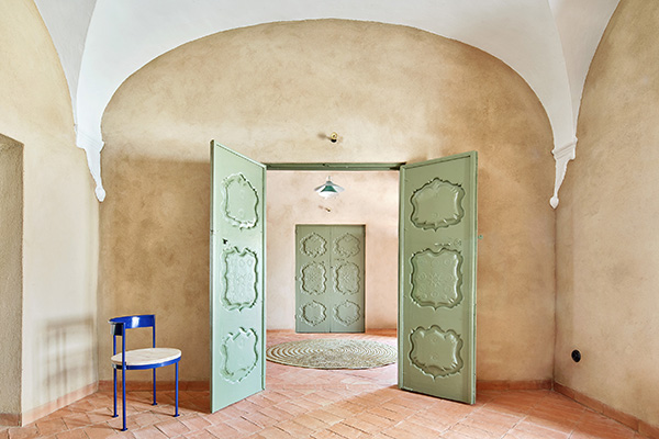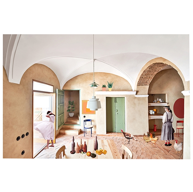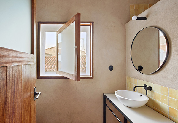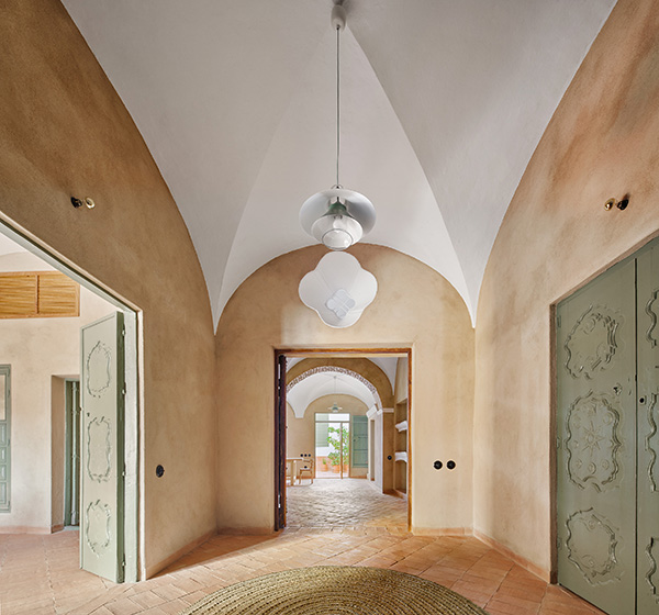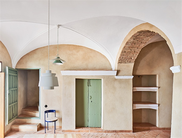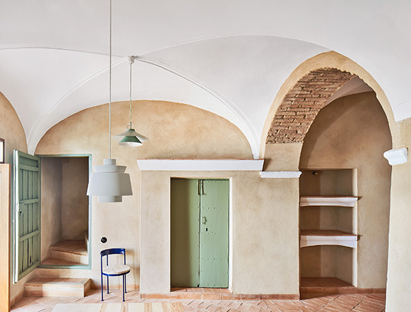 Desde un punto de vista material, se ha empleado un mortero de cal en bruto en todas las paredes y pintura a la cal en las bóvedas. El pavimento se ha realizado con ladrillo de tejar. Por su textura y vibración es el material protagonista del proyecto. La disposición diagonal e irregular de los dibujos del suelo, en referencia especular de los techos, permite diferenciar y datar esta solería como contemporánea. Este ladrillo manual se extiende también en el exterior por el patio hasta el borde de la pequeña alberca que se ha construido para refrescar los calurosos días de verano. Una de las actuaciones fundamentales en el proyecto ha sido la reconstrucción de los tejados, ganando cota para alojar todas las instalaciones de ahorro energético, se han terminado con teja curva árabe tradicional.