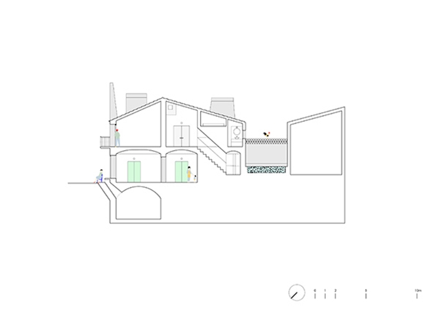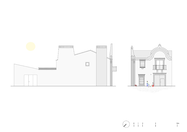 La casa, de dos plantas, posee una configuración con tres crujías de muros de carga y bóveda extremeña en planta baja. La estrategia del proyecto ha consistido en conectar, mediante una secuencia de espacios continua, la fachada norte de acceso con el patio de la fachada sur.