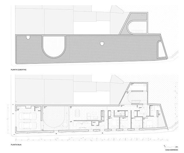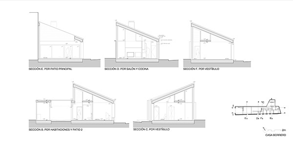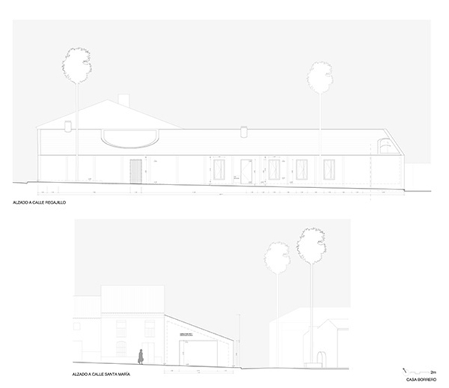 El programa se reparte funcionalmente con habitaciones alineadas a la fachada principal, ocupando el garaje la otrora fachada dominante, y separada del uso puramente residencial por un gran patio que funciona de entrada. Es objeto de nuestra propuesta que esta obligada separación no rompa la unidad del volumen. En una segunda banda se localizan las zonas húmedas y además funcionará de espacio de colchón con el pasillo, que se alarga paralelo al segundo muro de carga.