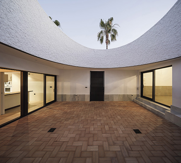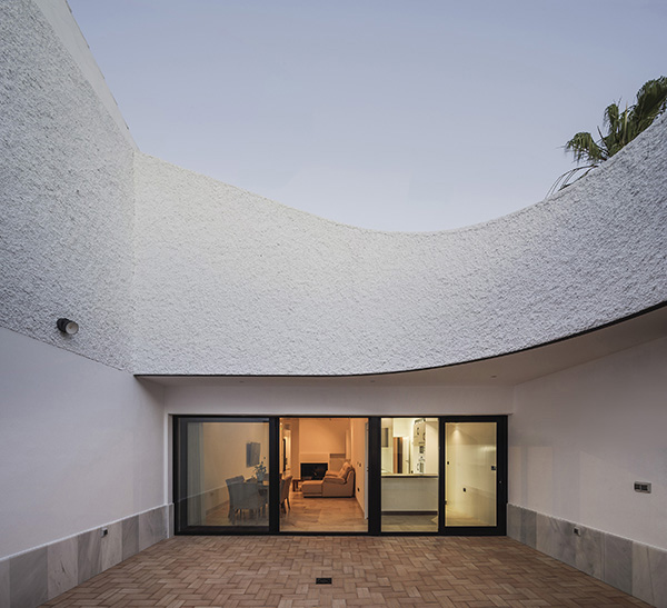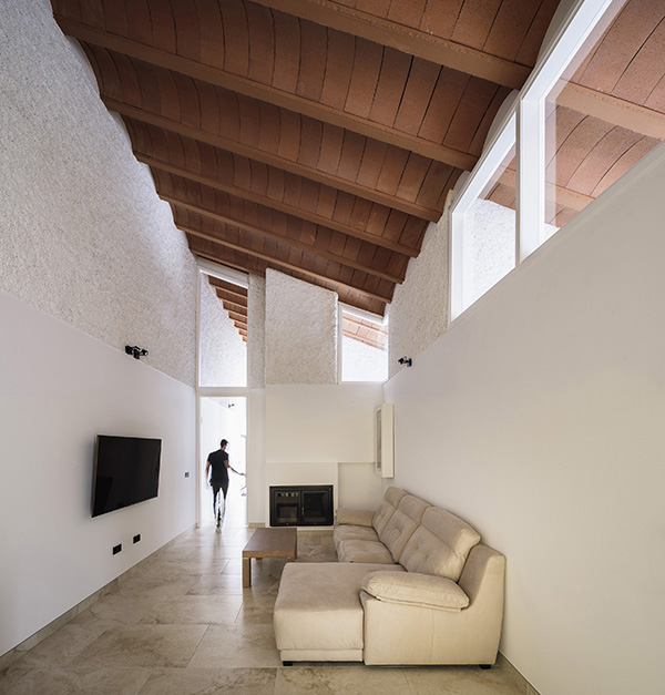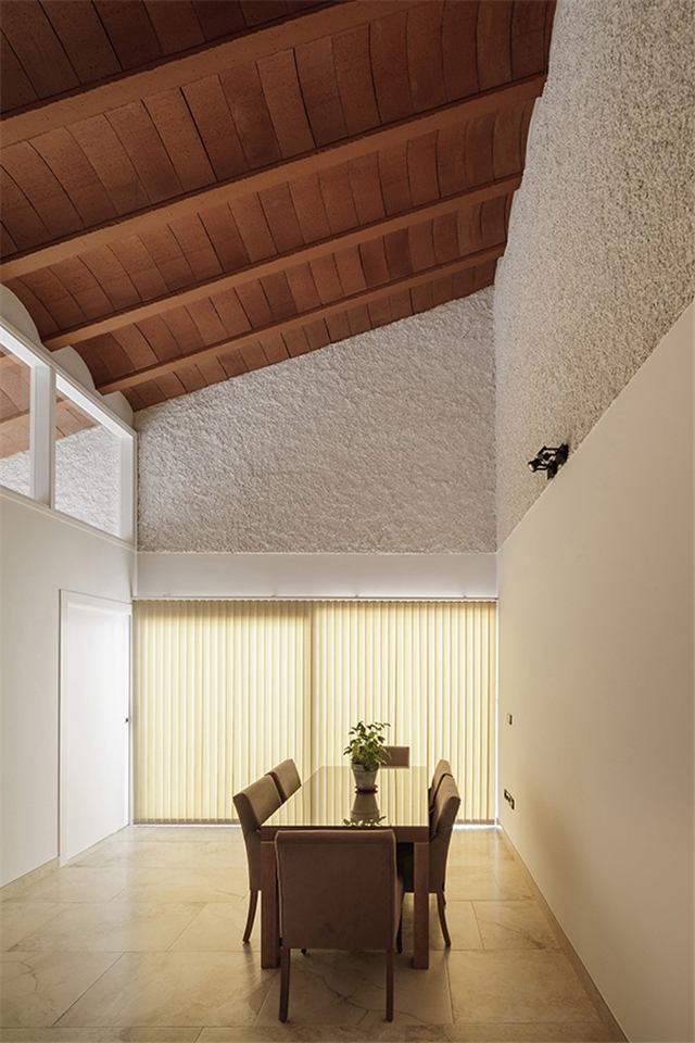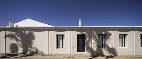Así, el forjado de cubierta, resuelto con viguetas de hasta 7 metros de longitud y bovedillas curvas se deja visto y apoya en dos muros de carga de 1 pie con apoyo de citara con enganches metálicos contra la flexión, y que en la fachada se construye con conjugando la pieza básica rectangular de ladrillo cara vista blanco Malpesa Ibiza y la pieza especial con esquina curva. Con ellas y el buen hacer de la cuadrilla de albañiles, se consigue una fachada curvada y ritmada que soporta mejor, tanto estética como estáticamente, la gran cubierta inclinada de teja plana. En este nuevo orden de paños reside la diferencia entre el ritmo y el tedio. Esperamos que esta vivienda hable más de lo primero que de lo segundo.