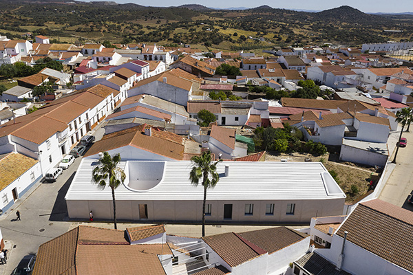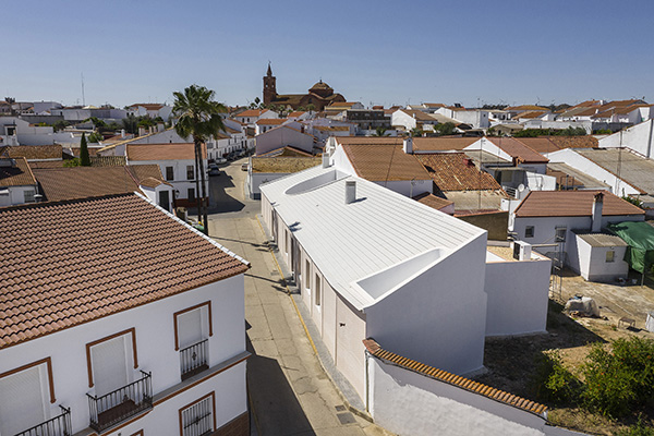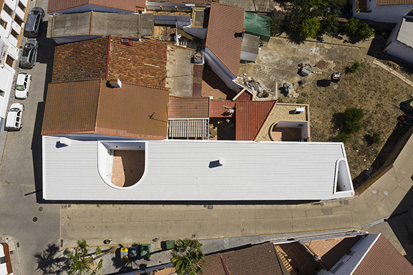 En Alosno, un pueblo pequeño del Andévalo onubense, conocido por sus fandangos y sus chacinas de cerdo ibérico, la cercanía a las minas de Tharsis y su arquitectura inglesa, se nos encarga una casa que nuestro cliente describe como “tradicional”, con un programa compacto y muy compartimentado que incluye además un garaje exento de la vivienda. Otro requisito será el disponer todo el programa en una sola planta, en una parcela en esquina que tiene siete metros de fachada y cuarenta de profundidad.