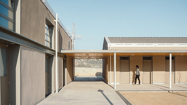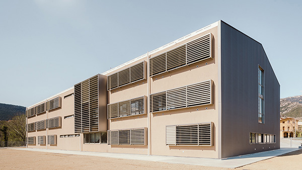 Los edificios principales se cubren con cubierta inclinada a dos aguas de teja cerámica plana, siendo este otro material natural, sostenible y completamente reciclable. Se establece así un diálogo entre la cubierta de la escuela, el núcleo urbano y el paisaje. El proyecto está dispuesto en una parcela deprimida respecto al núcleo urbano, de modo que las visuales funden los límites de la cubierta de la escuela con los tonos grisáceos del paisaje de la Sierra de Noet.