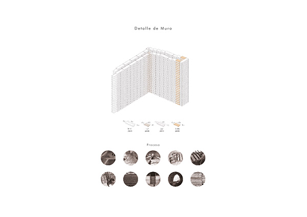 Las piezas de ladrillo fueron especialmente diseñadas y elaboradas artesanalmente. Se utilizó una mezcla de arena y arcillas, que dan al ladrillo un equilibrio de elasticidad y dureza. Fueron diseñados cuatro moldes de distintas dimensiones para resolver el aparejo. Los colores de la pieza dependen de la exposición a la llama, así esta obtiene un color más o menos rojizo.
