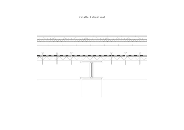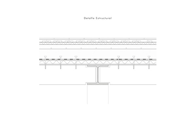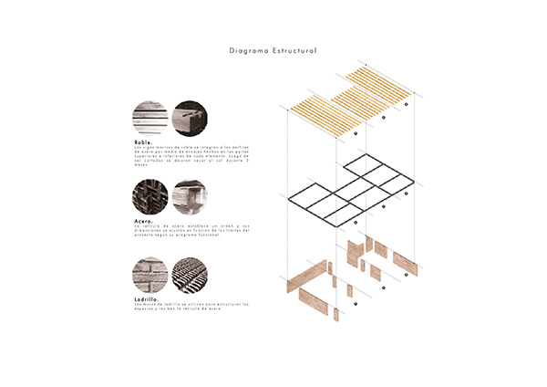 La unidad del ladrillo y sus dimensiones estudiadas determinan el tamaño de los espacios y del módulo de los marcos metálicos de la estructura de acero que se apoyan encima de los muros de ladrillo. Esta retícula metálica modula el proyecto de manera elástica según las necesidades y límites deseados. Se trata entonces de una sistematización flexible que da un orden implícito a todo el proyecto. Por medio de encajes integramos las vigas de roble macizo a los perfiles de acero que forman la retícula.