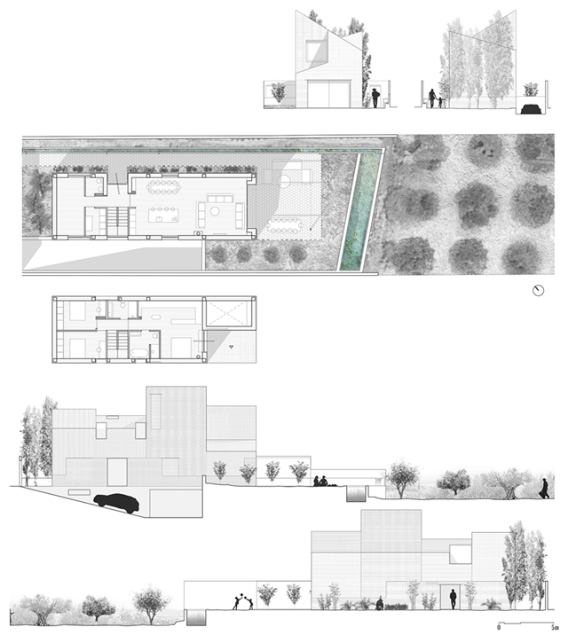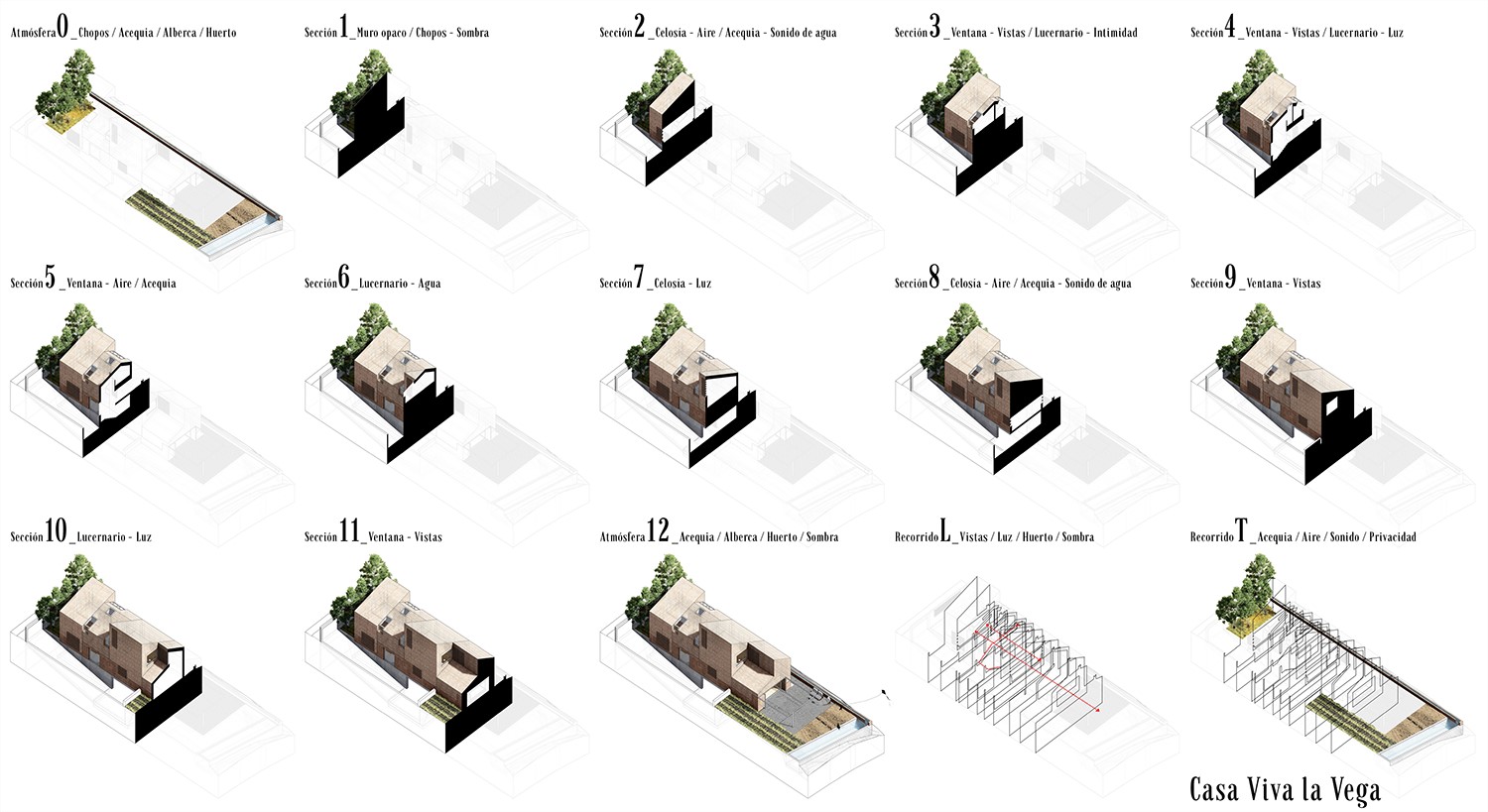 El proyecto trató de dar respuesta a la geometría de la parcela adoptando una configuración alargada, lo cual recuerda también a los secaderos. Esta situación permitía una relación e intercambio interesante entre ambas fachadas largas, debido a su proximidad. Propusimos una serie de secciones que iban respondiendo a las diferentes condiciones de contorno dependiendo de su posición. Aparecieron así muros opacos de diferentes alturas, cubiertas con diversas inclinaciones, lucernarios, celosías y ventanas según la oportunidad de vistas lejanas, entrada directa o tamizada de luz, presencia de edificaciones cercanas, contacto con la acequia o el huerto y necesidad de privacidad. Era nuestra intención que en determinados puntos de la casa existieran vistas que la cruzaran por completo, permitiendo que la luz, el aire, el sonido del agua y la mirada pudieran atravesar el espacio contenido en el interior de la crujía. Vanesa, Horacio, Marco y Mauro podrían recorrer el volumen de manera longitudinal, a través de las secciones que se suceden y establecen relaciones espaciales cambiantes según las horas del día y las estaciones.