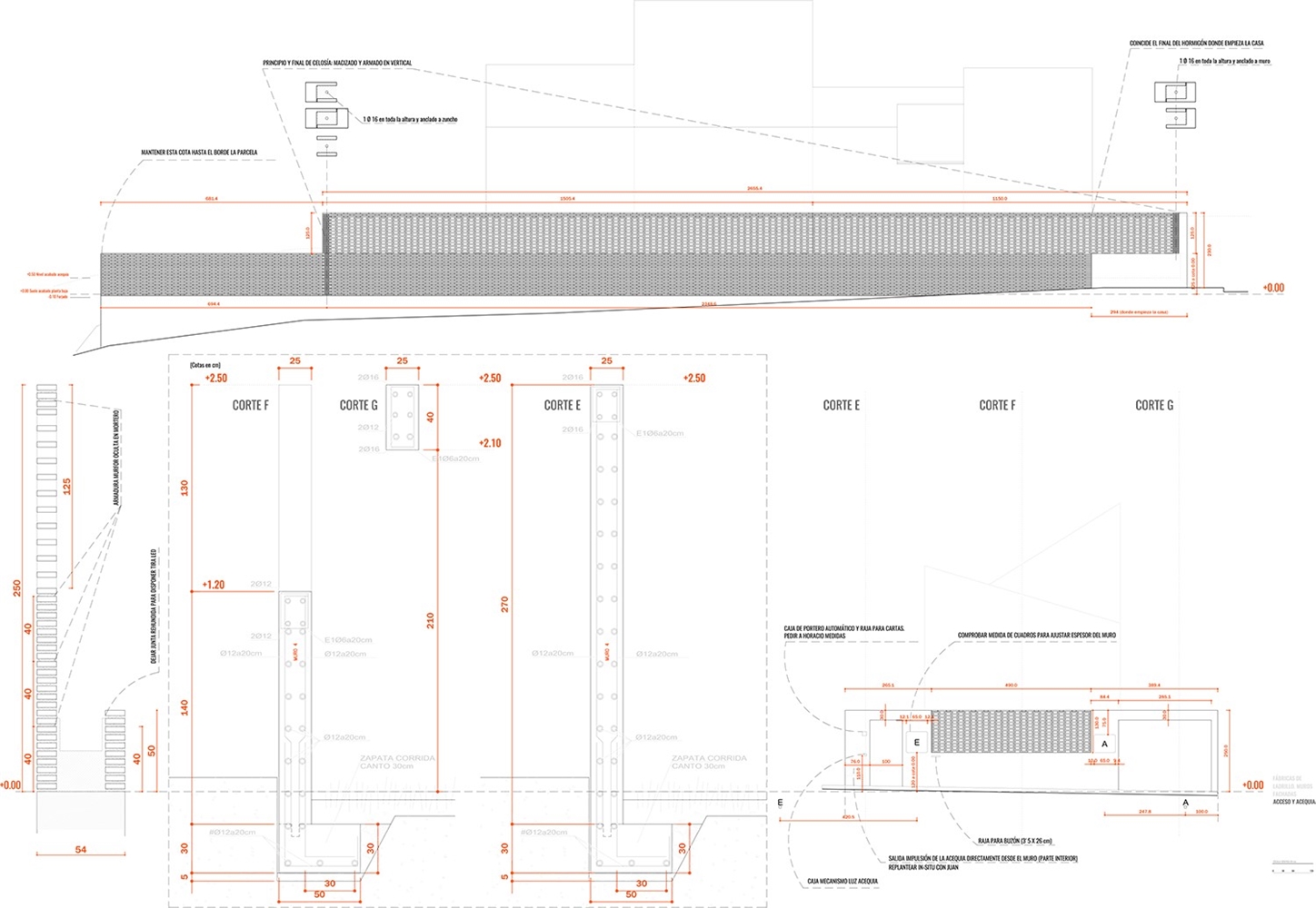Los recuerdos de infancia de Horacio y Vanesa se encuentran ligados a la vega de Granada; el rumor de las acequias, el frescor a la sombra de los chopos, la materialidad y la luz en el interior de los secaderos o el paisaje lejano de Sierra Nevada. En 2017, tras adquirir una parcela cercana a Albolote, a los pies del Tajo Colorao y frente a un olivar, nos encargaron realizar una casa con el deseo de que tratáramos de enlazar esa imagen agrícola de la vega que residía en su memoria con sus necesidades familiares actuales. La parcela es de proporciones estrechas, situación agravada por la existencia de una servidumbre de paso para uso del acequiero en uno de los lados largos. Este recorrido es necesario para realizar las labores diarias de mantenimiento de la acequia que linda con uno de los lados cortos.