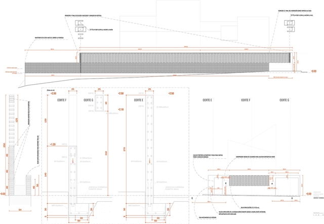 Se ejecutó un zócalo realizado con aparejo flamenco que recogía las distintas configuraciones de fachada y dotaba de unidad a la misma, así como de un contacto con el plano del suelo uniforme.