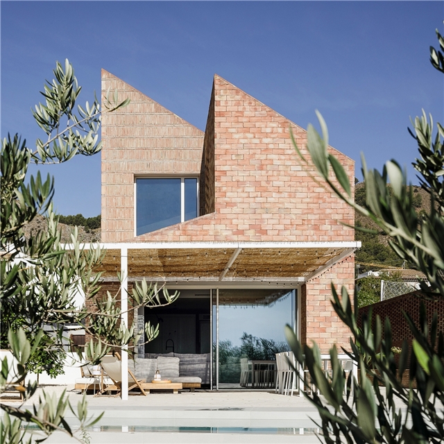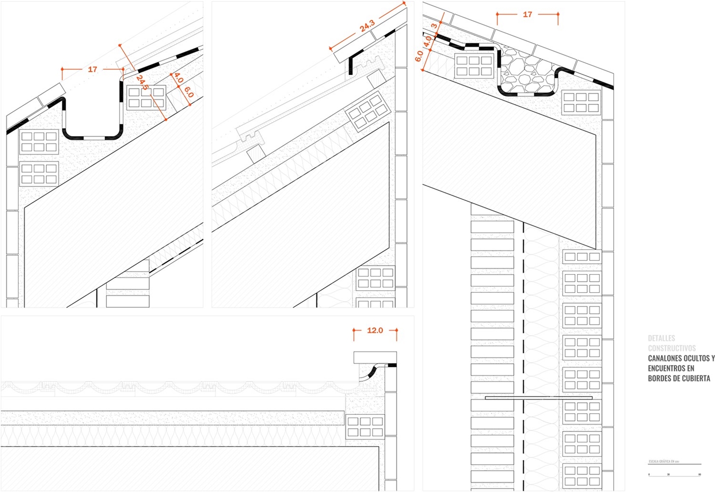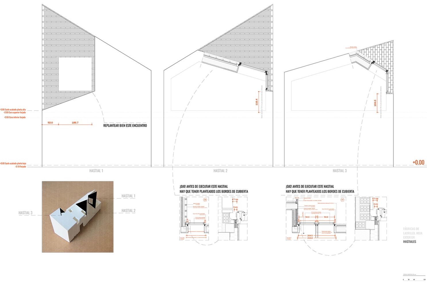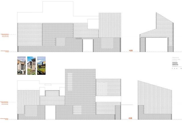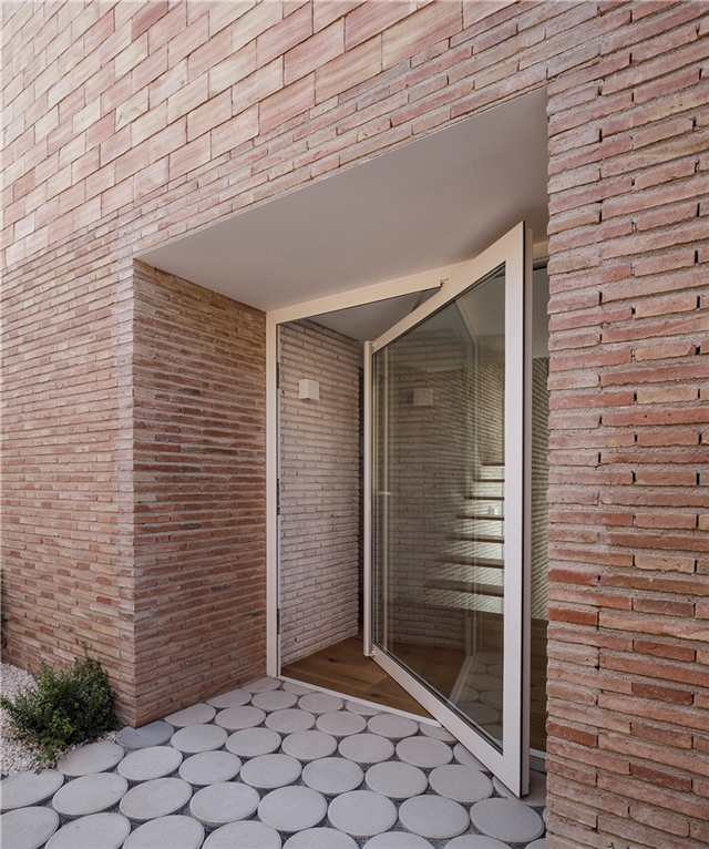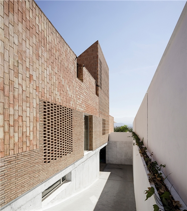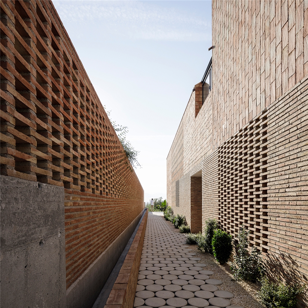 Haciendo uso del mismo tipo de ladrillo rústico cara vista para dar homogeneidad a la vivienda en cuanto a color y acabado, cada sección de la casa se resolvió con un aparejo: aparejo de panderete en vertical, aparejo de panderete en horizontal y aparejo de sardinel a soga en vertical, que fueron configurados como celosía en algunos puntos, dando lugar a la entrada de luz tamizada tan propia de las construcciones vinculadas a lo agrícola.