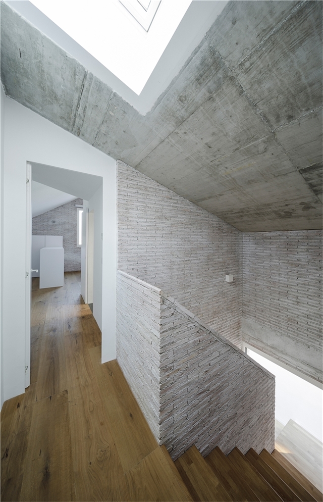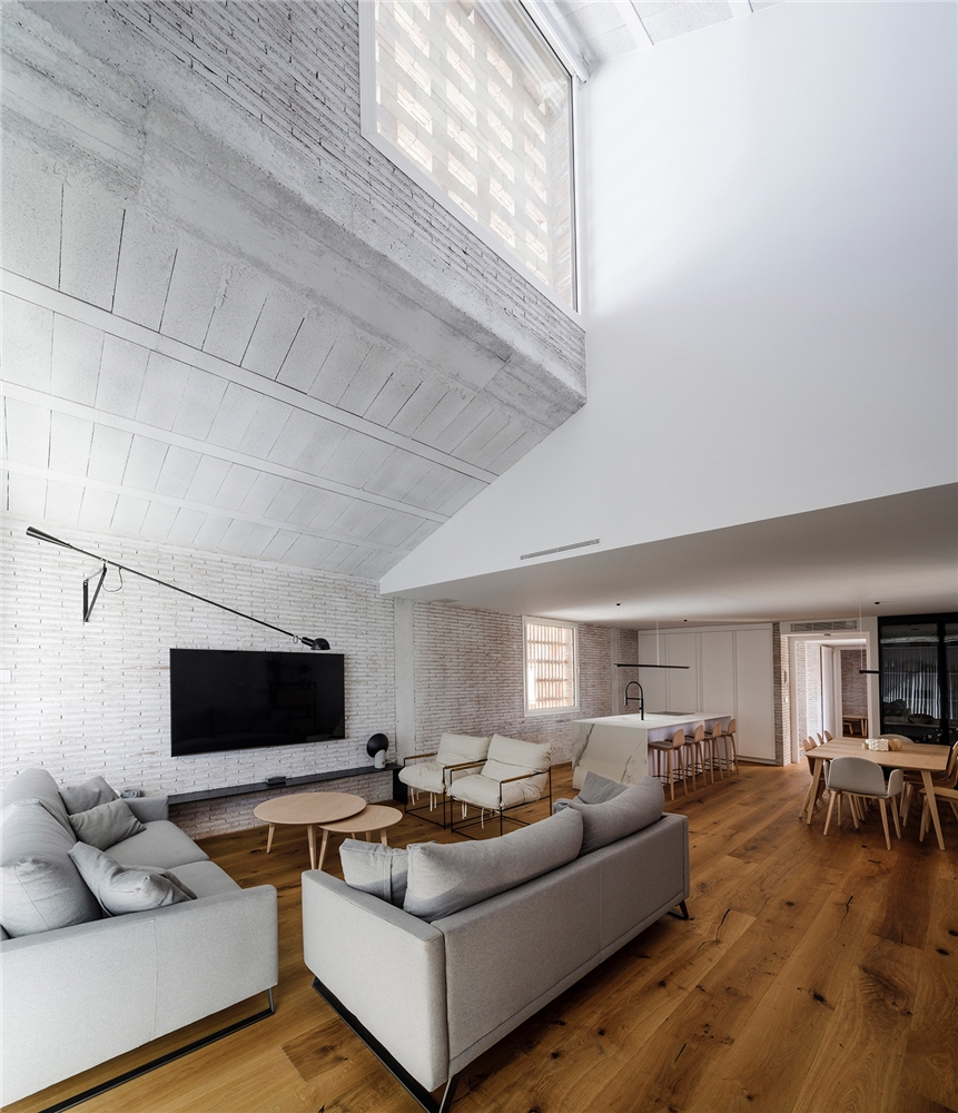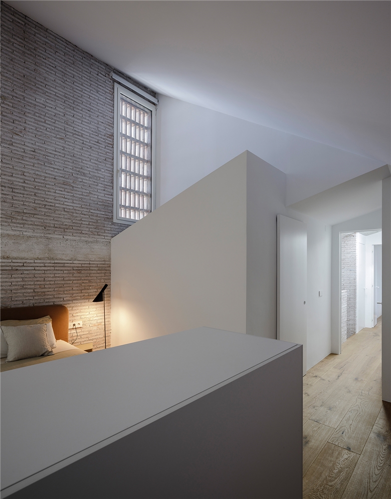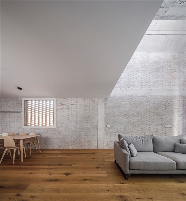 La cara interior de la capuchina fue resuelta también con ladrillo cara vista, con aparejo de soga, en coherencia con el tipo de construcción que evoca, y fue matizada con una capa de ‘aguapintura’ para ofrecer un fondo más neutro para la vida doméstica pero manteniendo su identidad y textura.