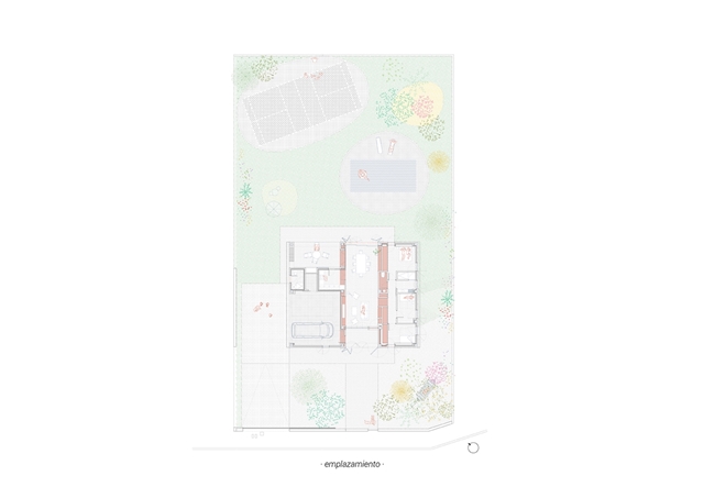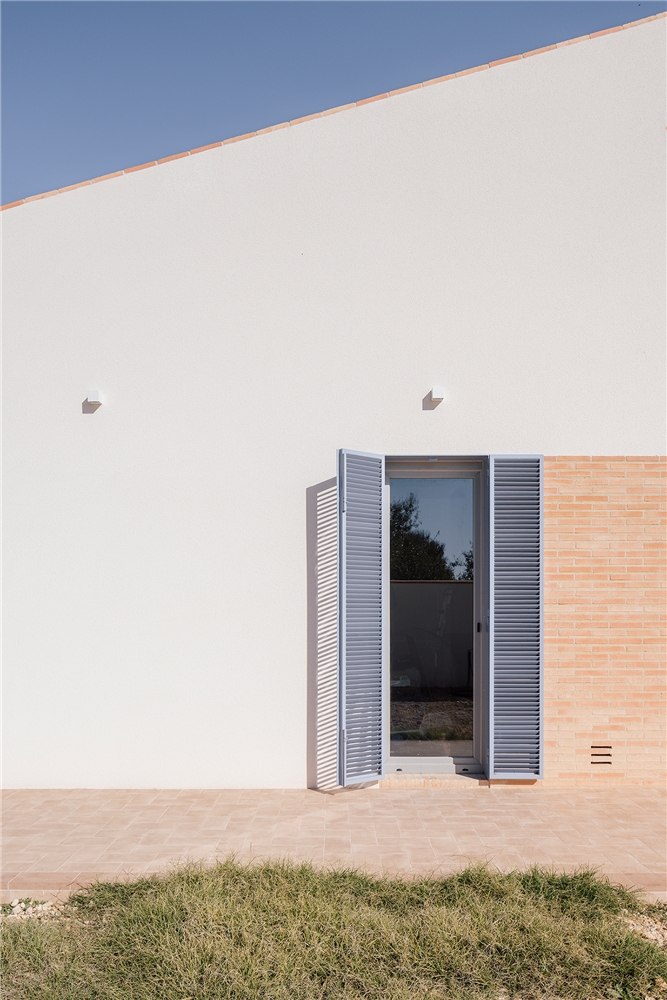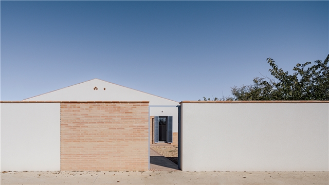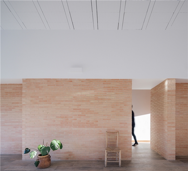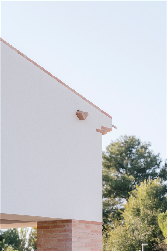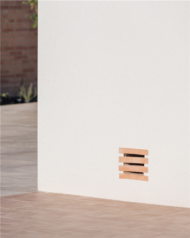 El uso de los materiales cerámicos articula y enfatiza los espacios. El ladrillo, semi-manual, visto, con llaga ancha, tiene la cualidad de absorber cierto grado de humedad, lo que permite prolongar la situación de confort. Este efecto, permite un desayuno agradable en la entrada y hasta una merienda fresca en el porche trasero. En el interior, los techos con la bovedilla cerámica vista, también refuerzan este efecto. El pavimento, cerámico, se extiende como una alfombra hacia el acceso, convirtiéndolo en una extensión del mismo ancho del salón al porche y al camino de entrada. La cubierta de teja mixta, también cerámica, se microventila para evacuar el calor y evitar que llegue al interior. Y toda ella está rematada por ladrillo, desde el alero escalonado, hasta los remates laterales y los aliviaderos de crecida del canalón.