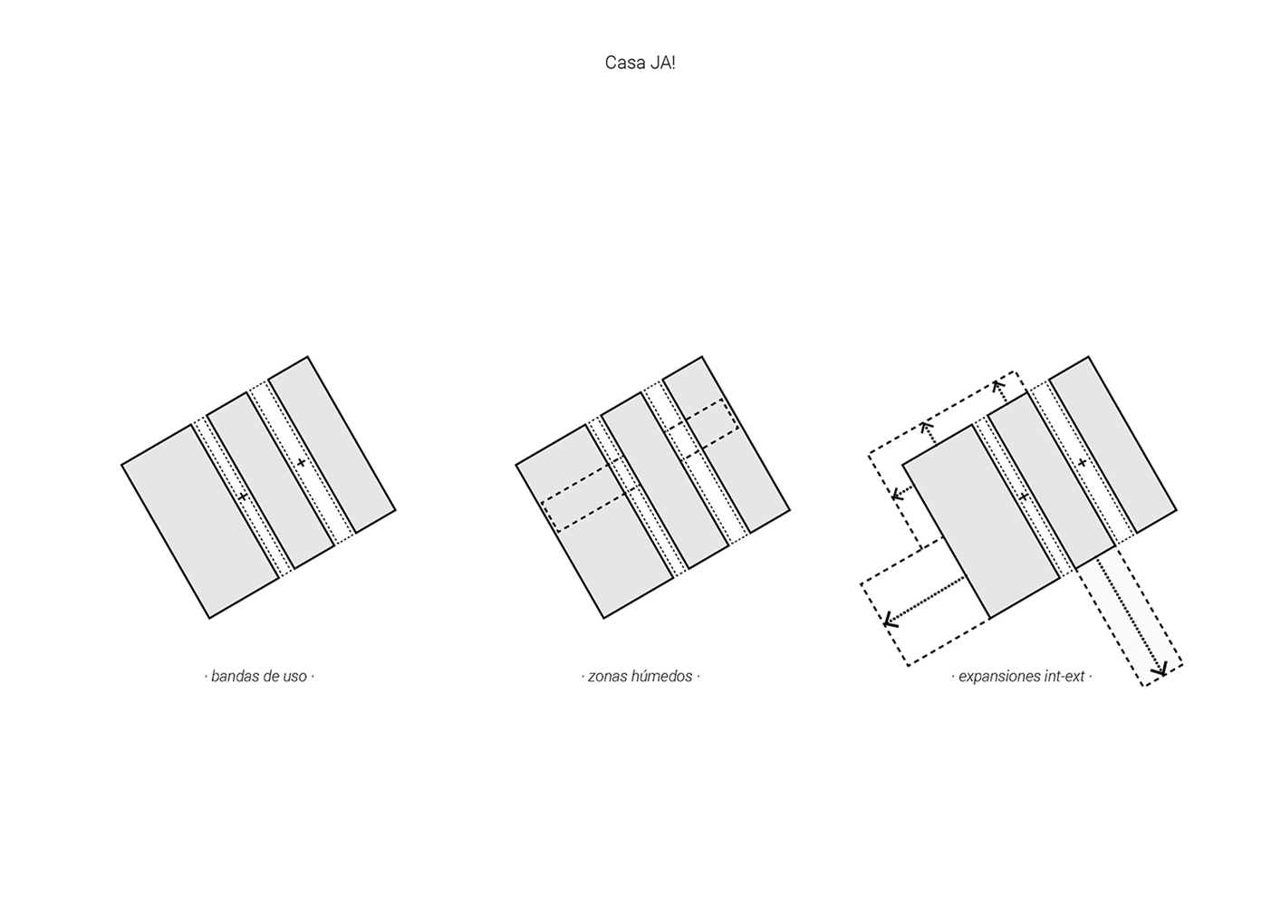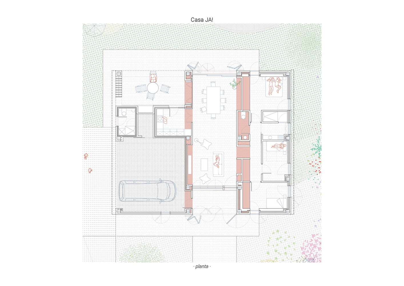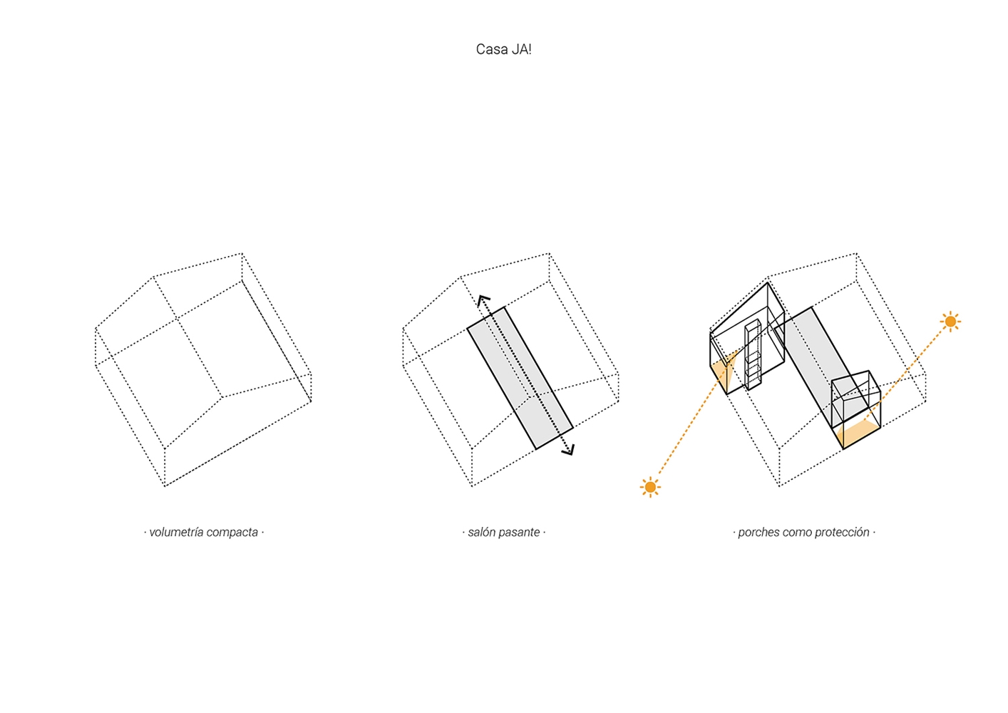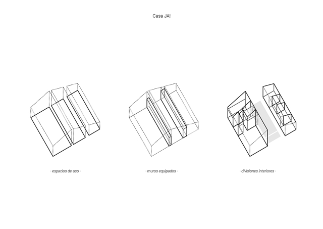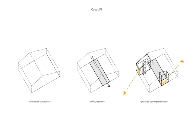 La Casa JA! es una sucesión de espacios y de rincones que comparten el objetivo de generar espacios donde disfrutar y compartir. Lo principal, lo central: es el salón; por allí pasa todo. Esta pieza es pasante, comunica el jardín delantero (de acceso y de invierno) con el jardín trasero (de estancia y de verano). Desde que se accede a la parcela se percibe la secuencia de jardín-casa-jardín.