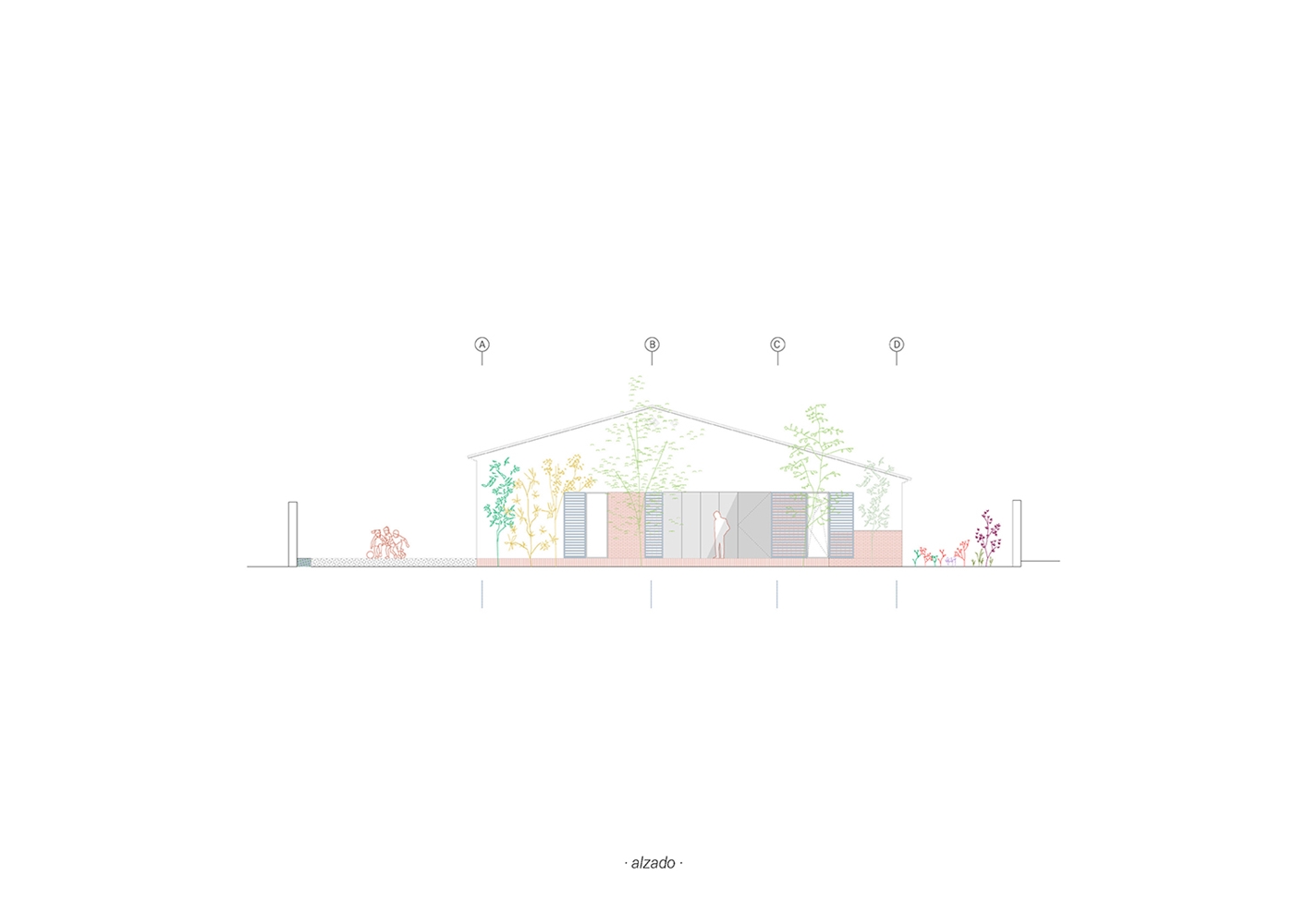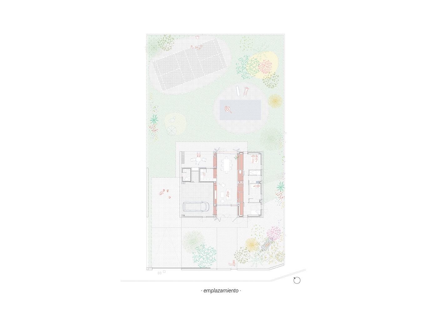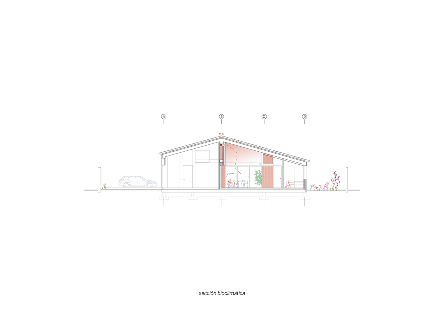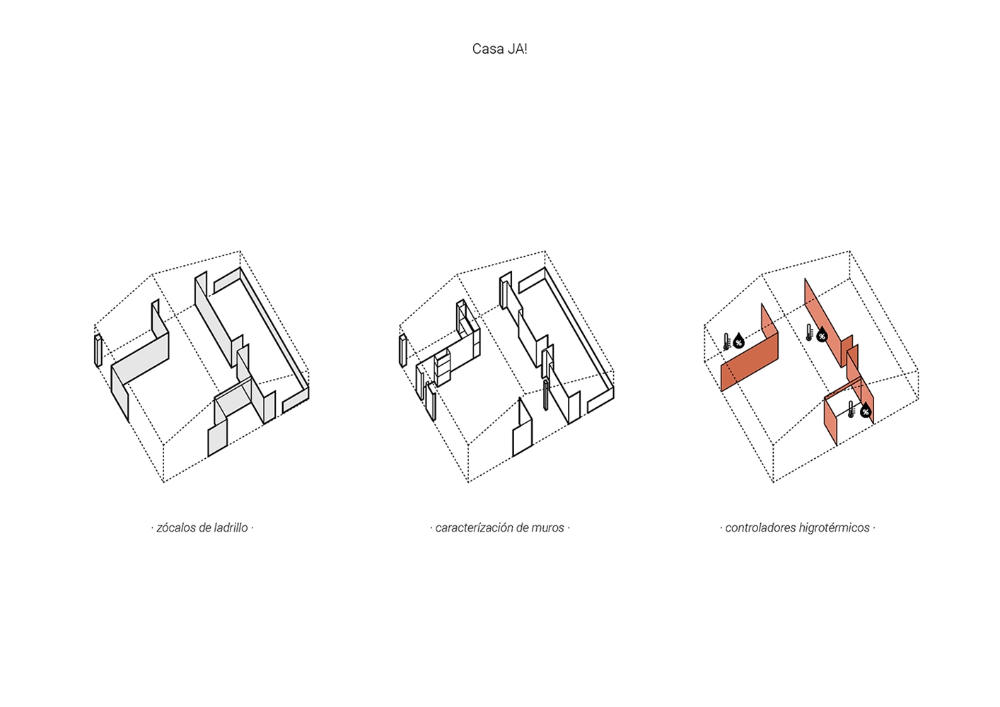 La Casa JA! es una sucesión de espacios y de rincones que comparten el objetivo de generar espacios donde disfrutar y compartir. Lo principal, lo central: es el salón; por allí pasa todo. Esta pieza es pasante, comunica el jardín delantero (de acceso y de invierno) con el jardín trasero (de estancia y de verano). Desde que se accede a la parcela se percibe la secuencia de jardín-casa-jardín.