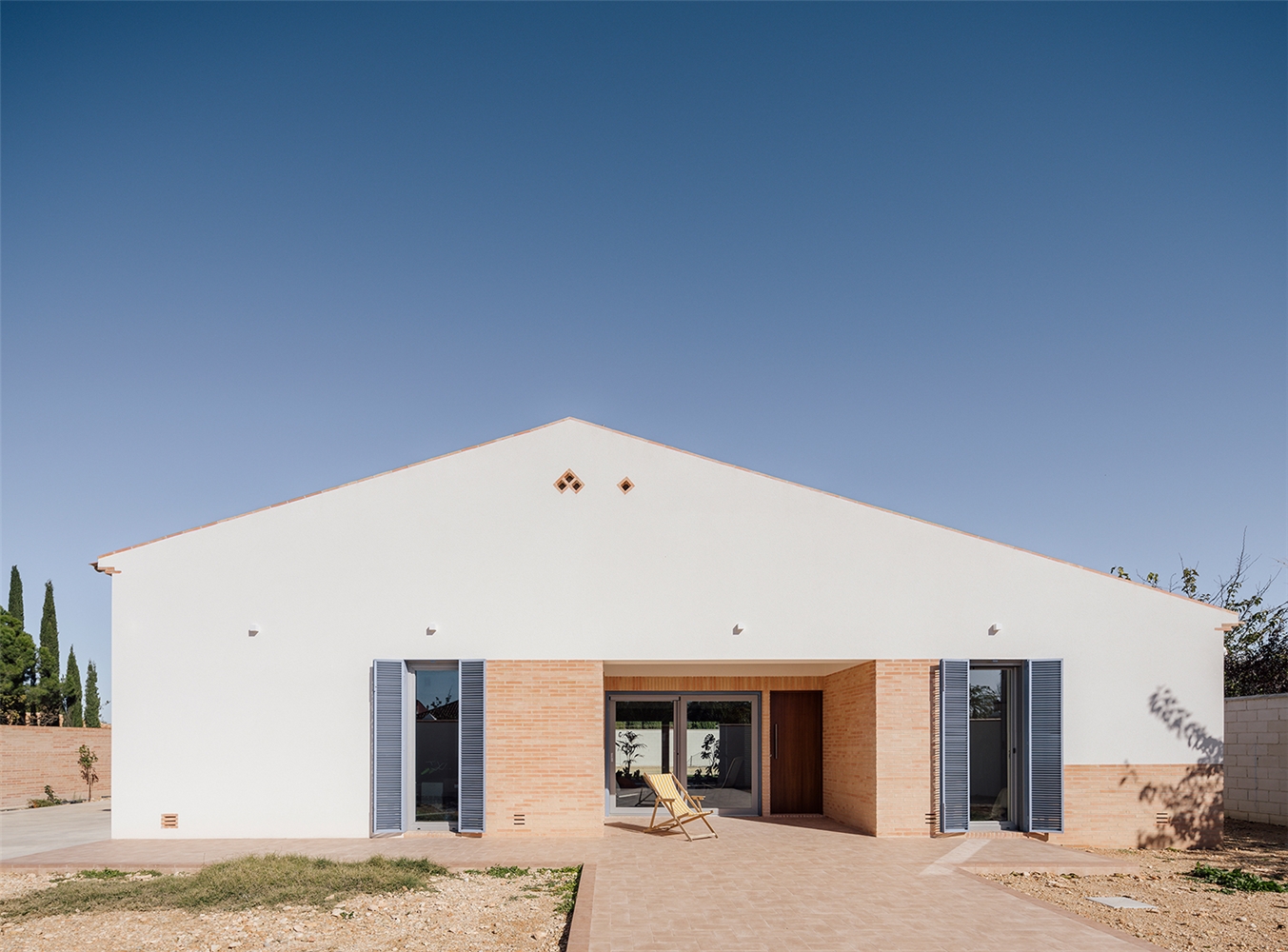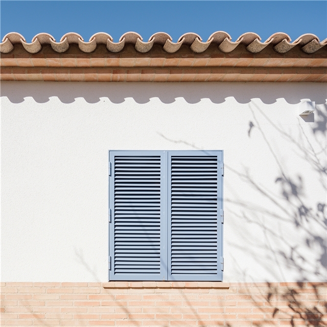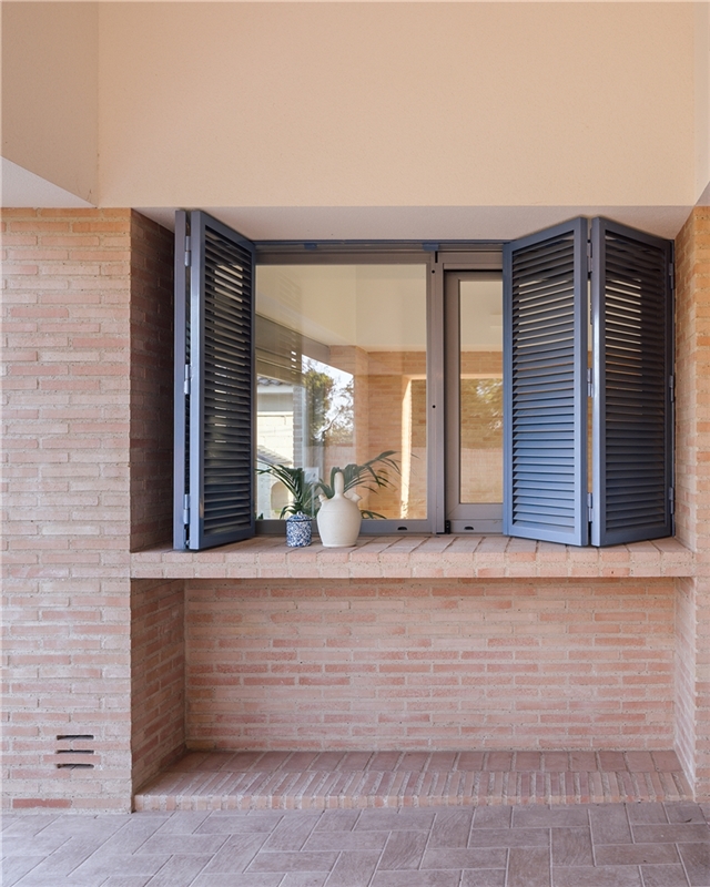 Y es que el ladrillo se convierte en un recurso expresivo que junto con las contraventanas de color añil y la volumetría reconectan con la vivienda tradicional manchega. Las ventilaciones, la imagen más reconocible de la casa -pues es casi lo único que asoma a la calle- recupera el tradicional “suspirón”. El ladrillo también se convierte en rejillas para la cámara sanitaria, en alfeizares y en umbrales mediante sardineles. Y el color añil, tan característico de los zócalos manchegos, se lleva a las contraventanas. De esta forma, la paleta tradicional se matiza, pero no se amplía.